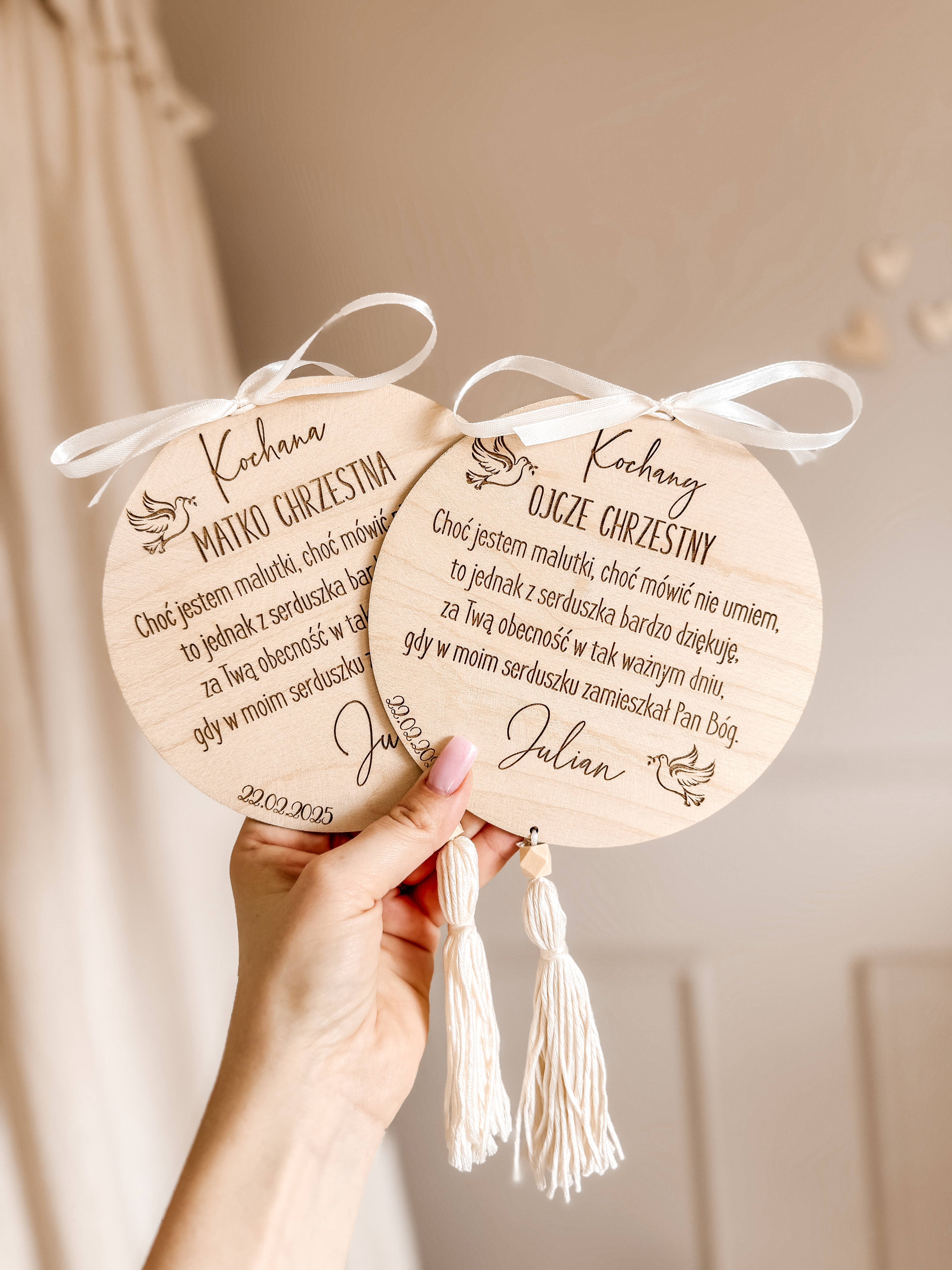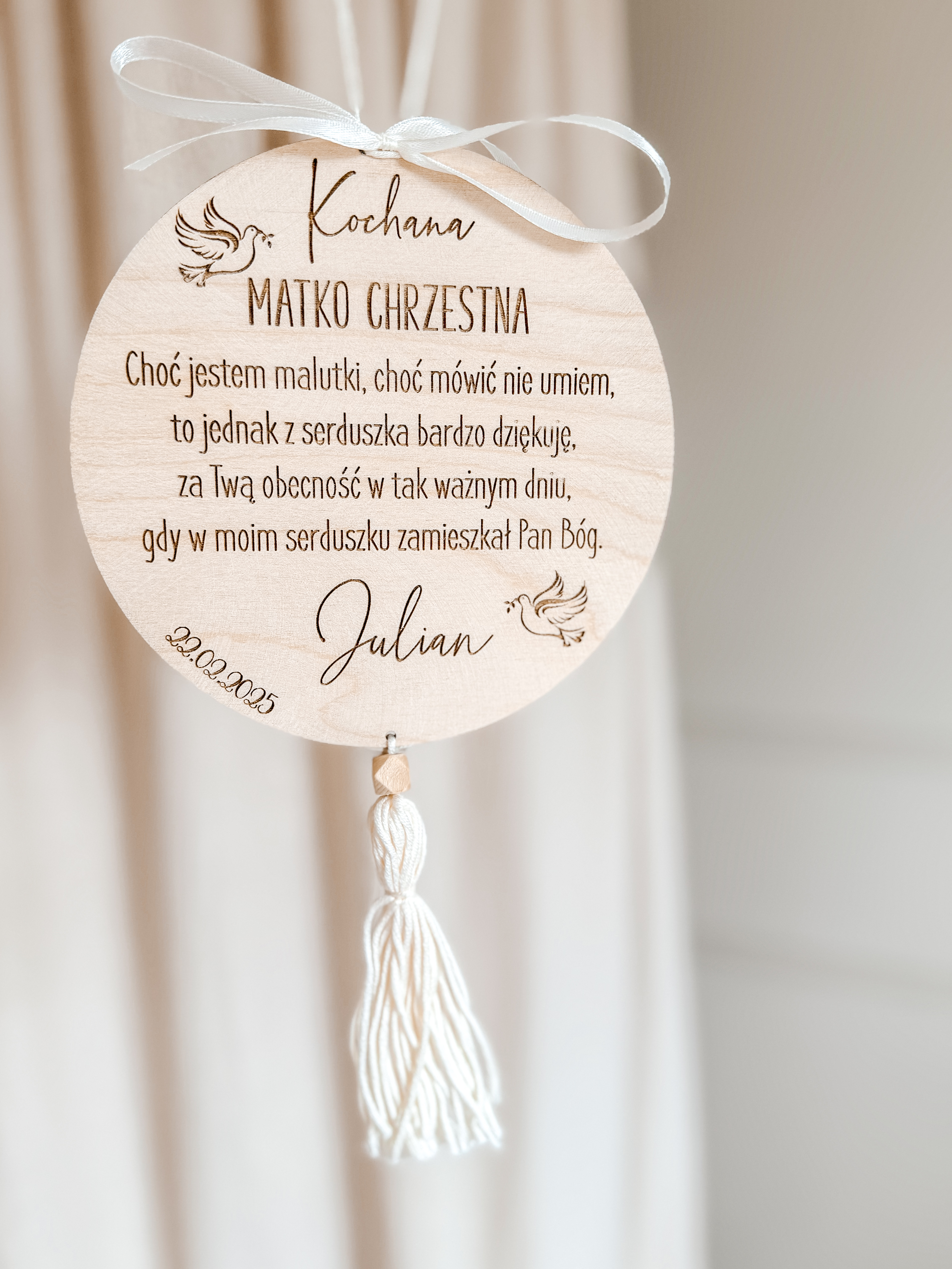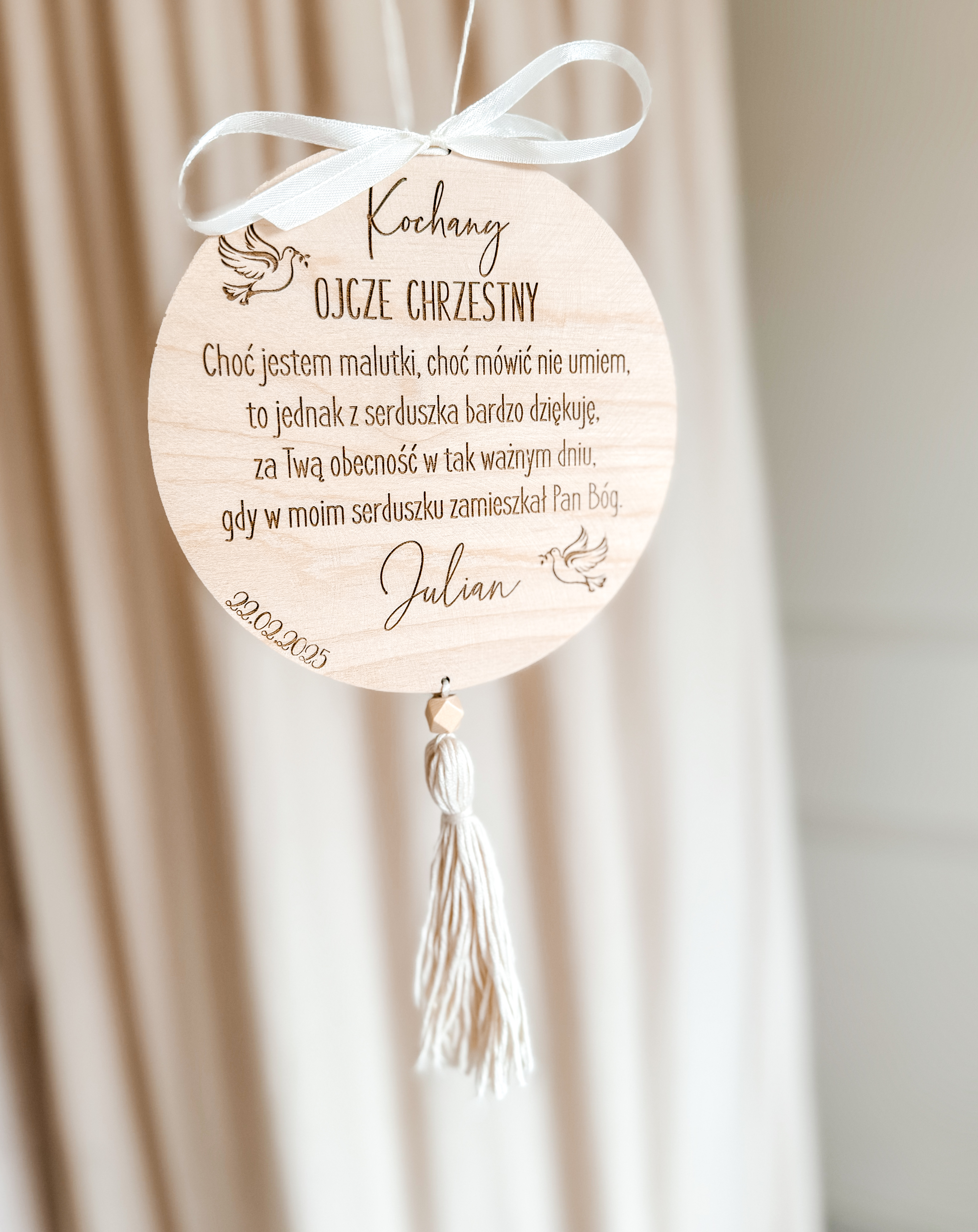 Personalizowana tabliczka to oryginalny pomysł na podziękowanie za przybycie dla Rodziców Chrzestnych lub dla gości, to również piękna pamiątka dla osoby obdarowanej. Do wyboru kolor dodatków (sznureczek do powieszenia, wstążeczka, frędzelek):