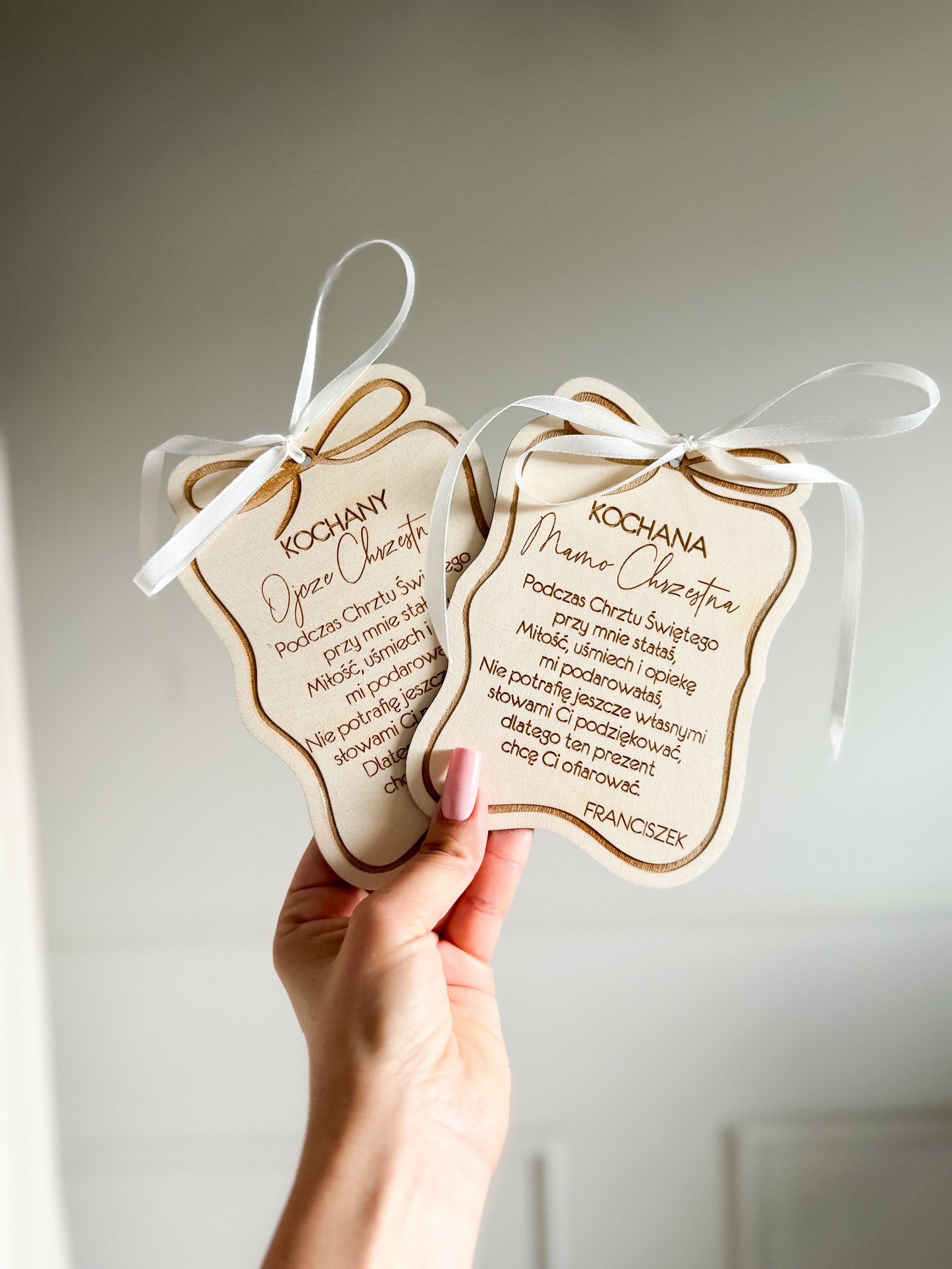 Personalizowana tabliczka to oryginalny pomysł na podziękowanie za przybycie dla Rodziców Chrzestnych lub dla gości, to również piękna pamiątka dla osoby obdarowanej. Do wyboru kolor dodatków (wstążeczka):