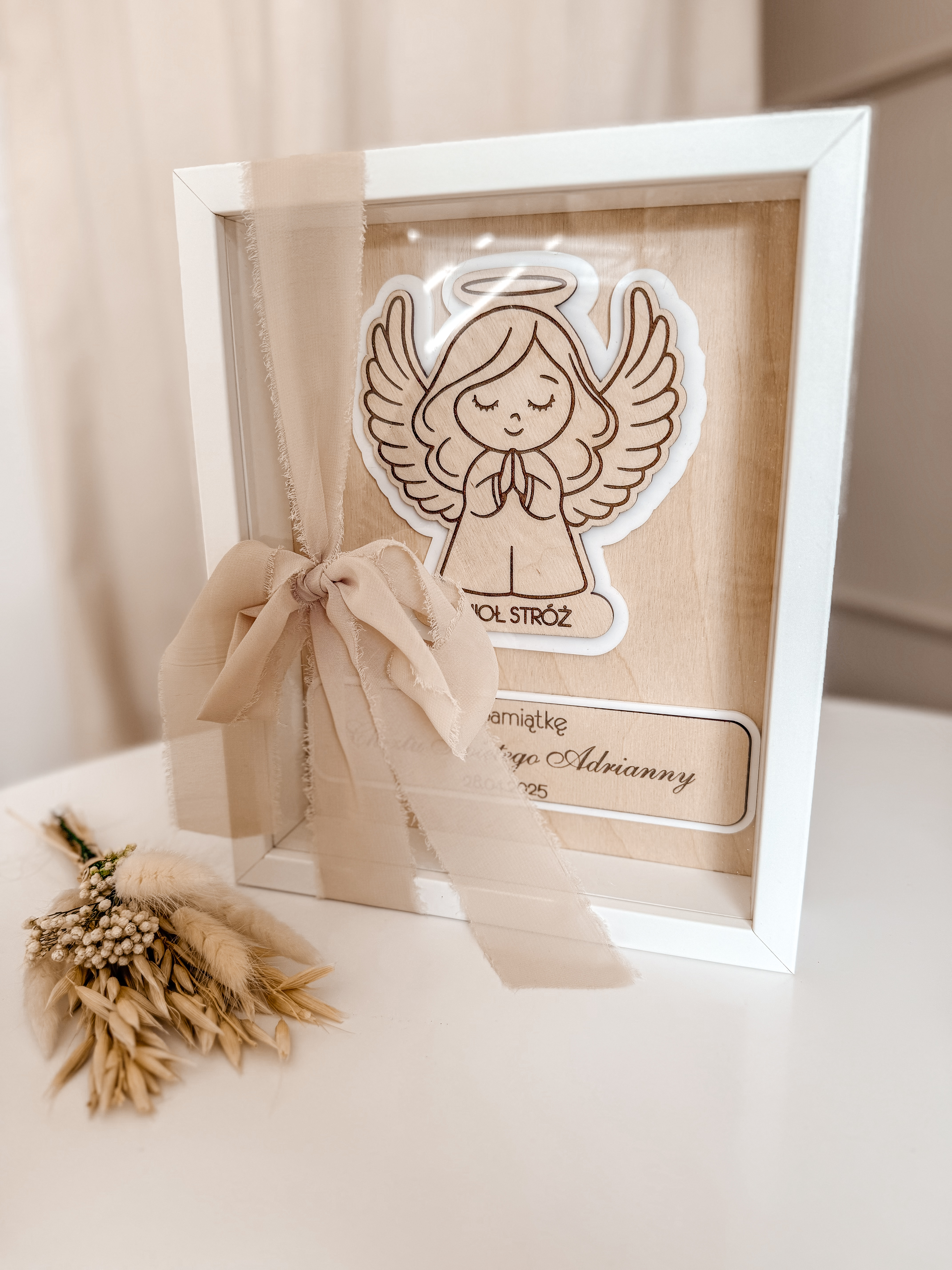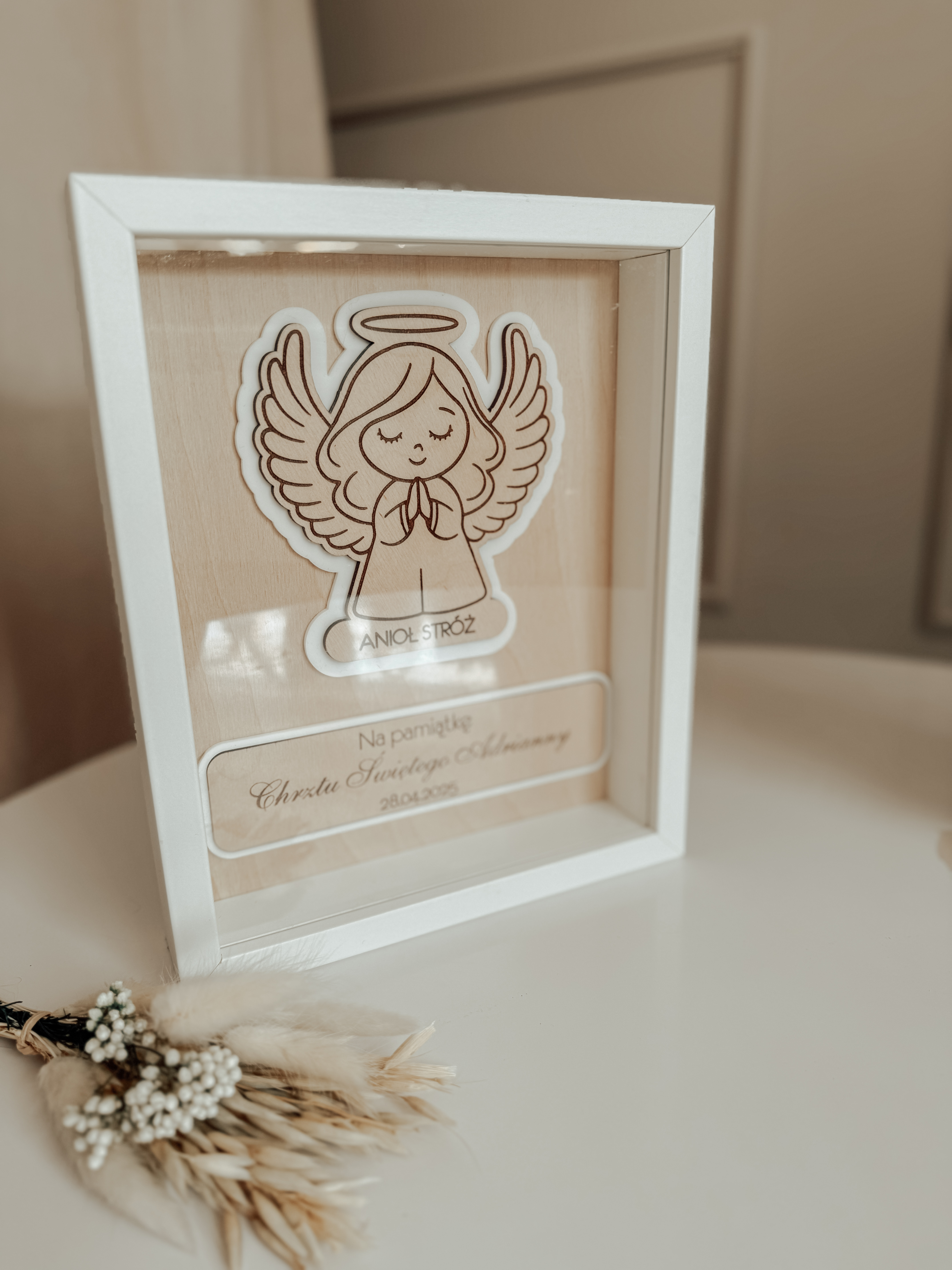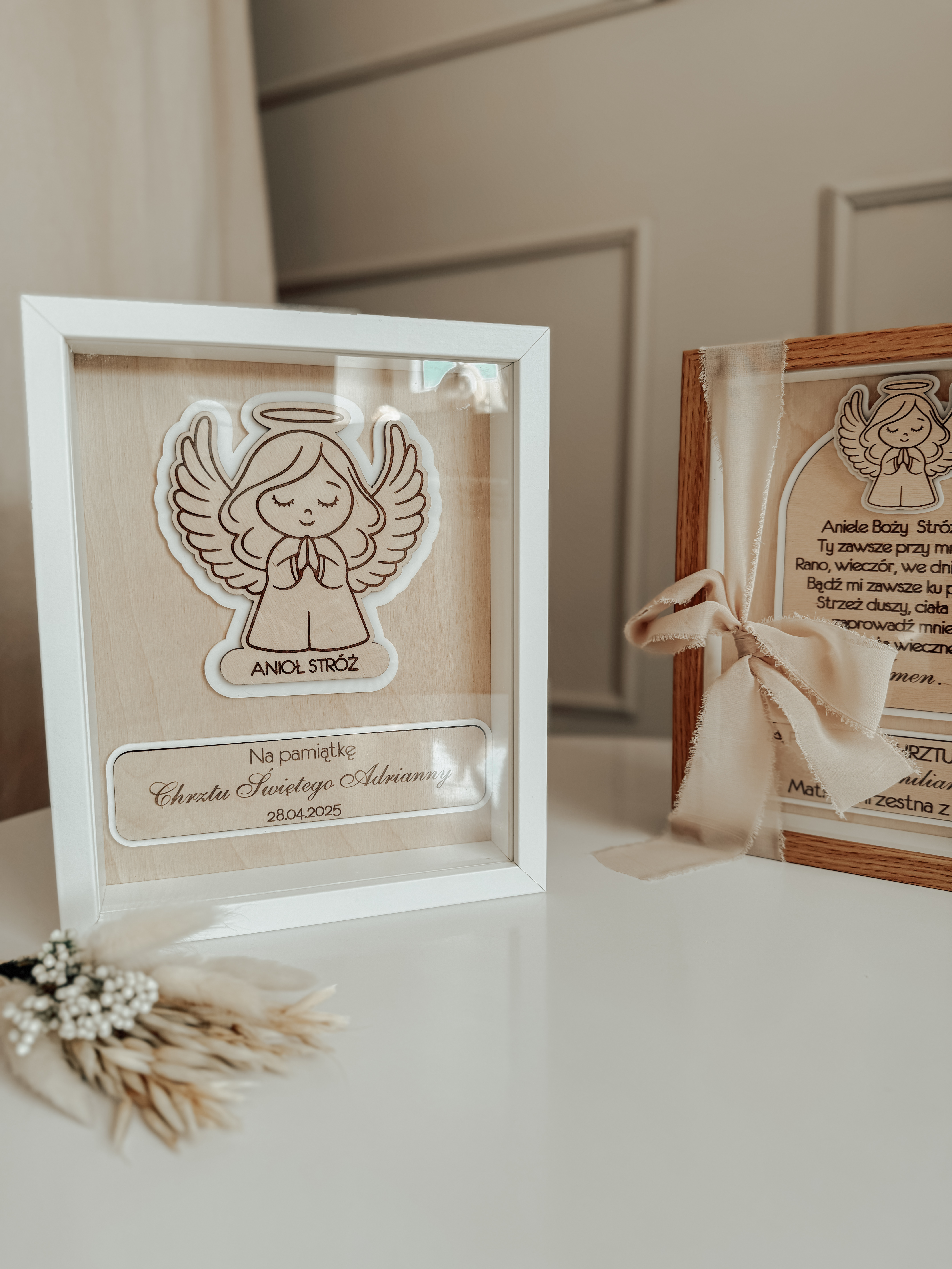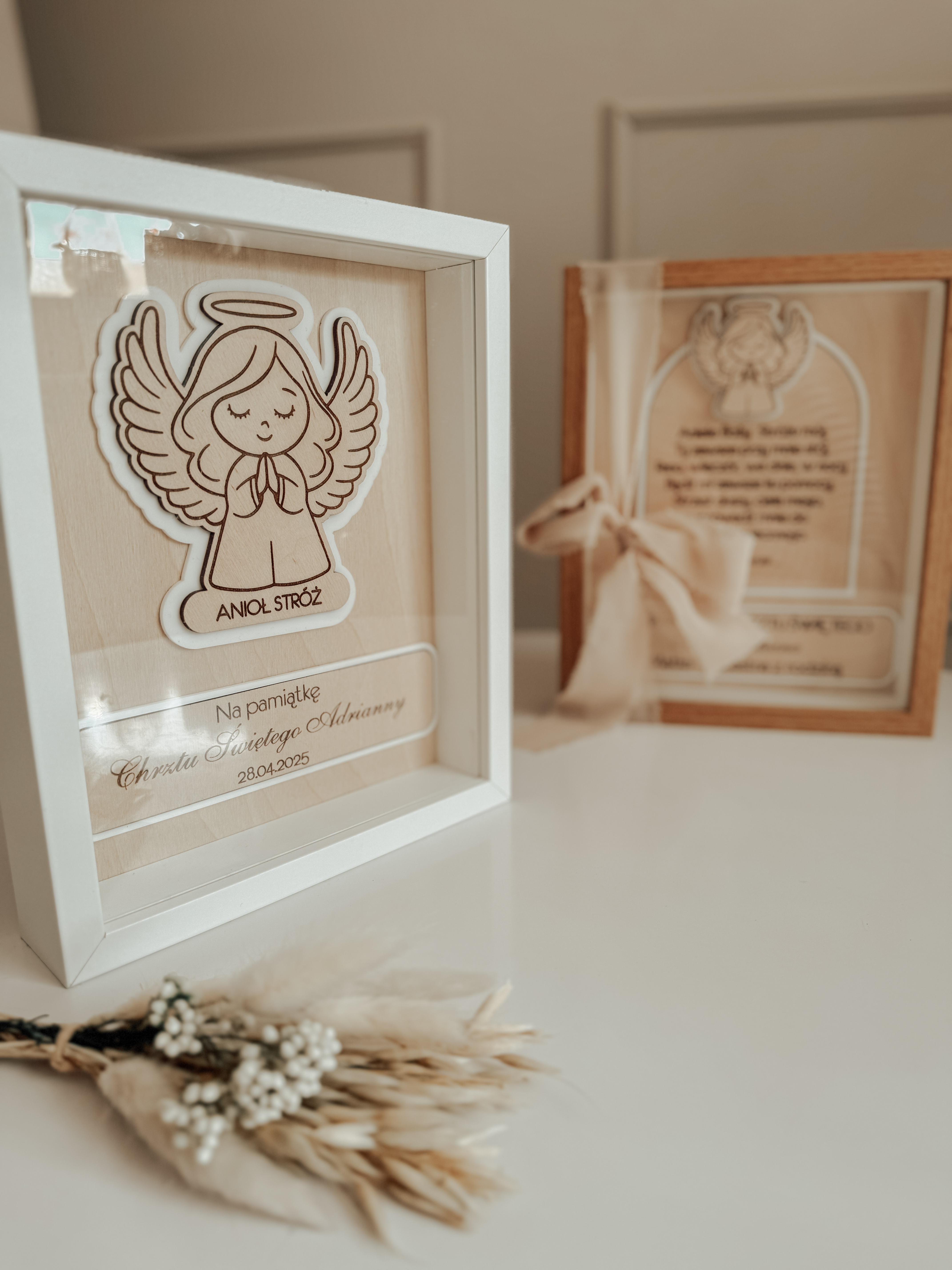 Całość umieszczona jest w eleganckiej, drewnianej ramce, co dodaje jej trwałości i estetyki. Personalizowany napis z imieniem dziecka i datą chrztu sprawia, że jest to niezwykle sentymentalny i unikalny prezent, który będzie piękną pamiątką na długie lata.
