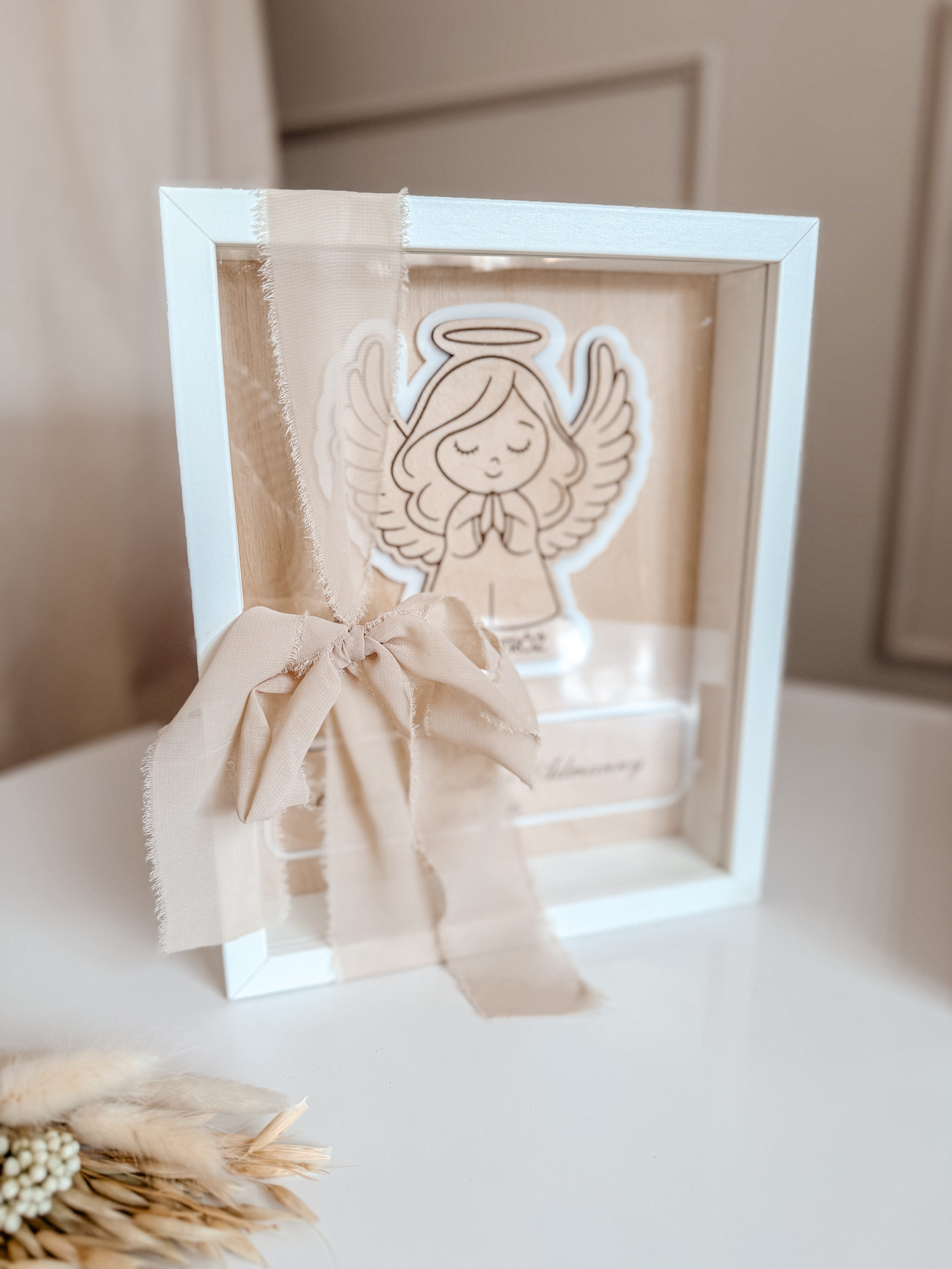 Produkt składa się z drewnianej tabliczki z laserowym grawerem Aniołka