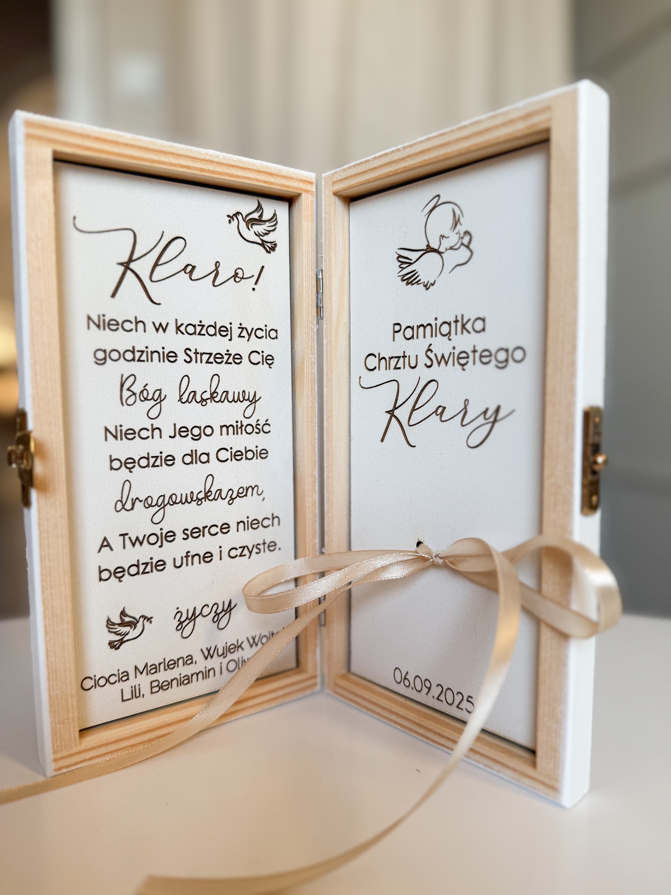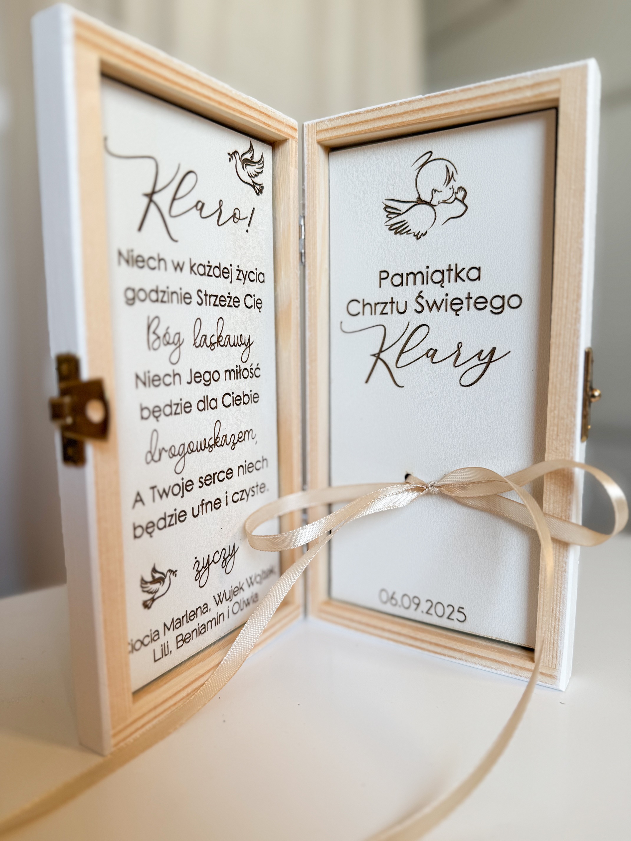 Drewniane pudełko z życzeniami na Chrzest Święty, które będzie niezwykłą pamiątką .