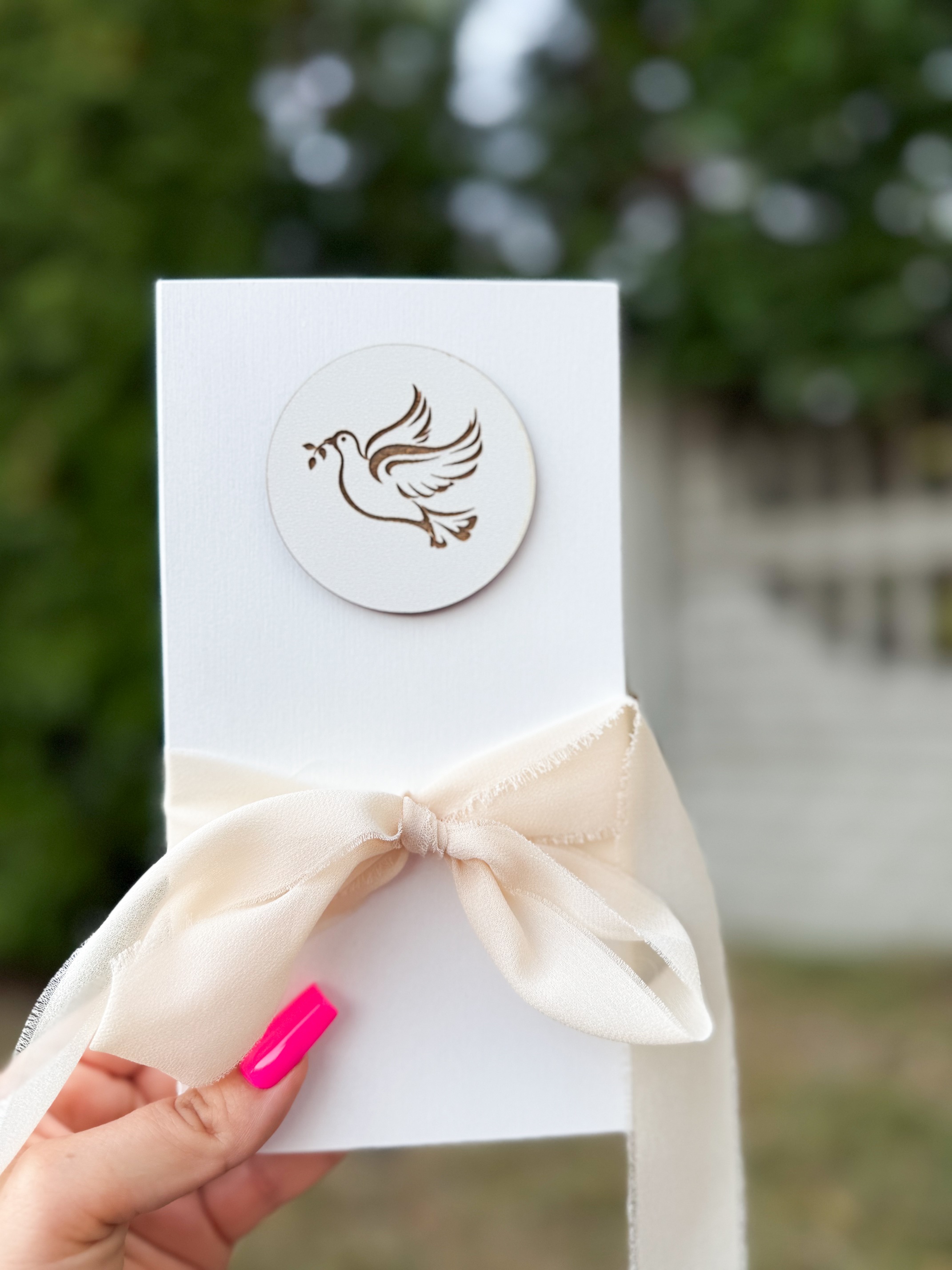 Pudełko przewiązane jest szyfonową wstążką, a na wierzchu znajduje się gołąbek.