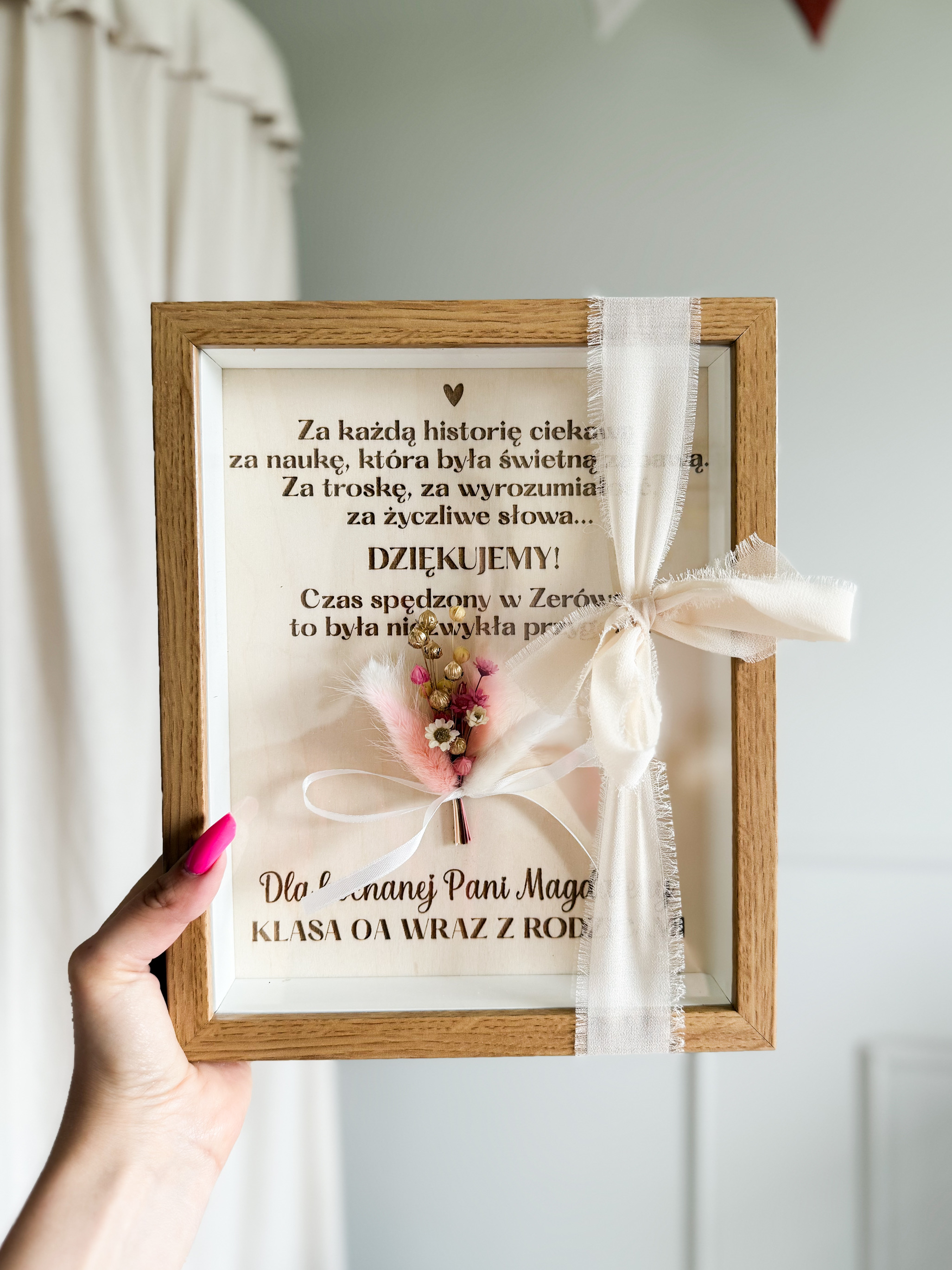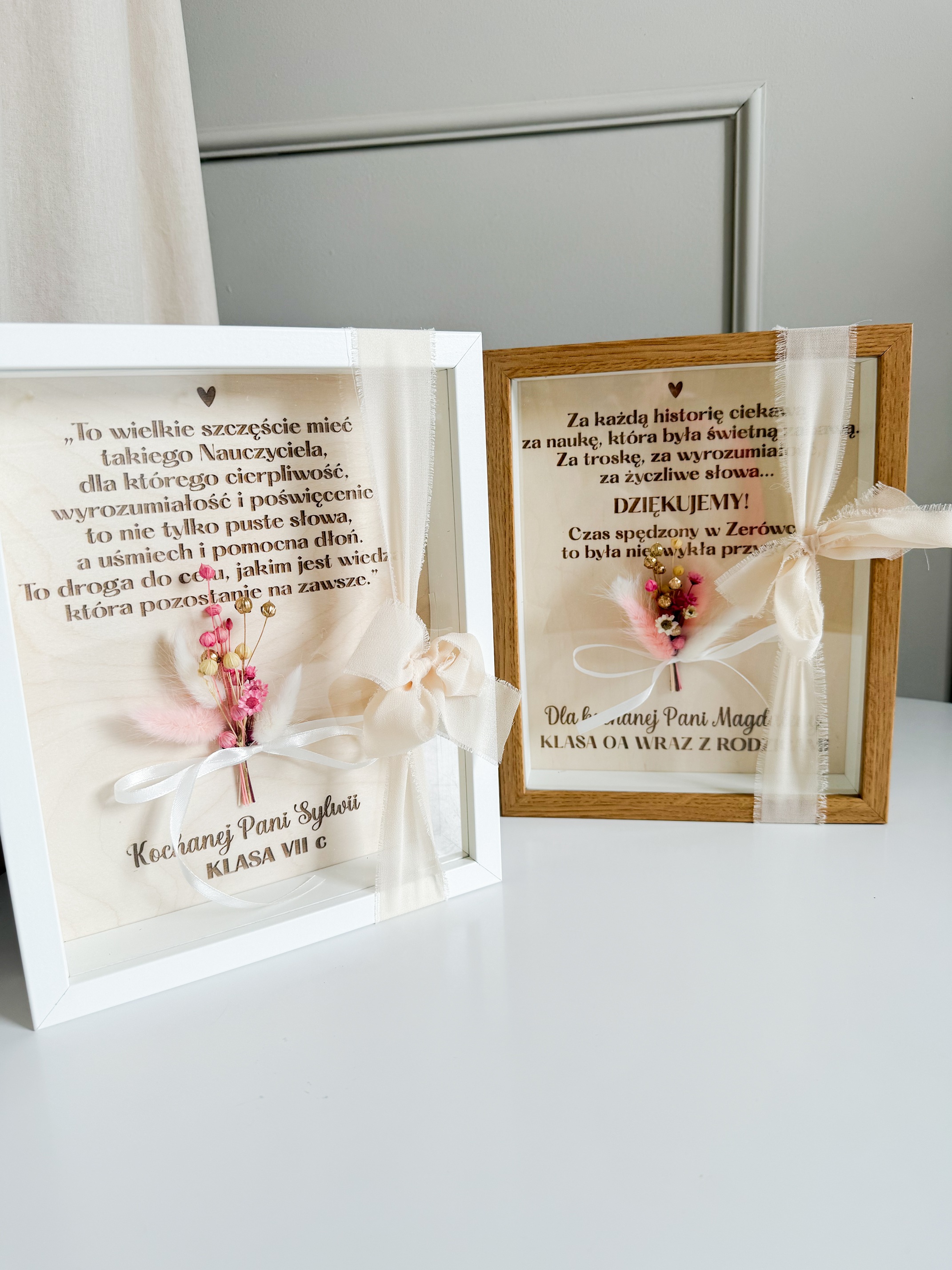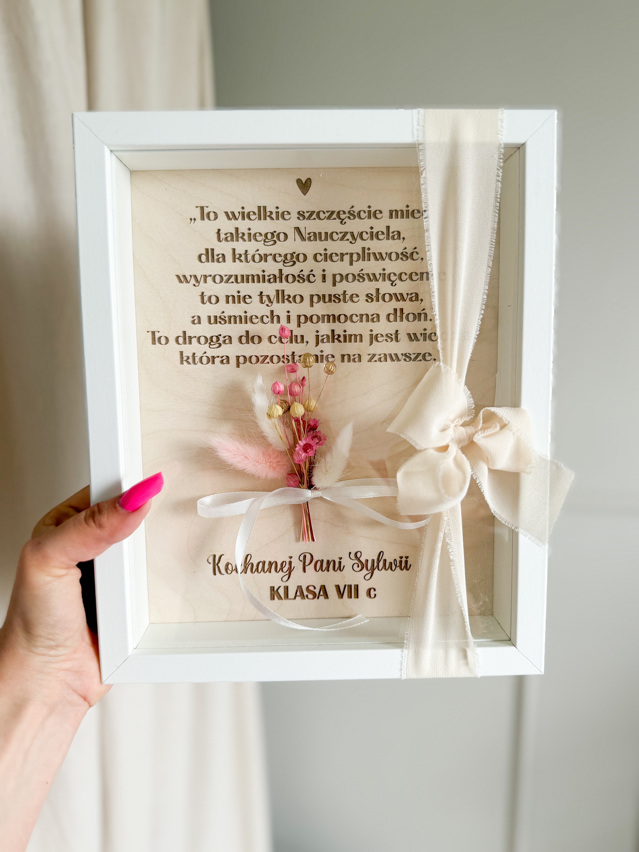Ramka z podziękowaniem i suszonym bukiecikiem – Personalizowany prezent dla nauczyciela lub wychowawcy