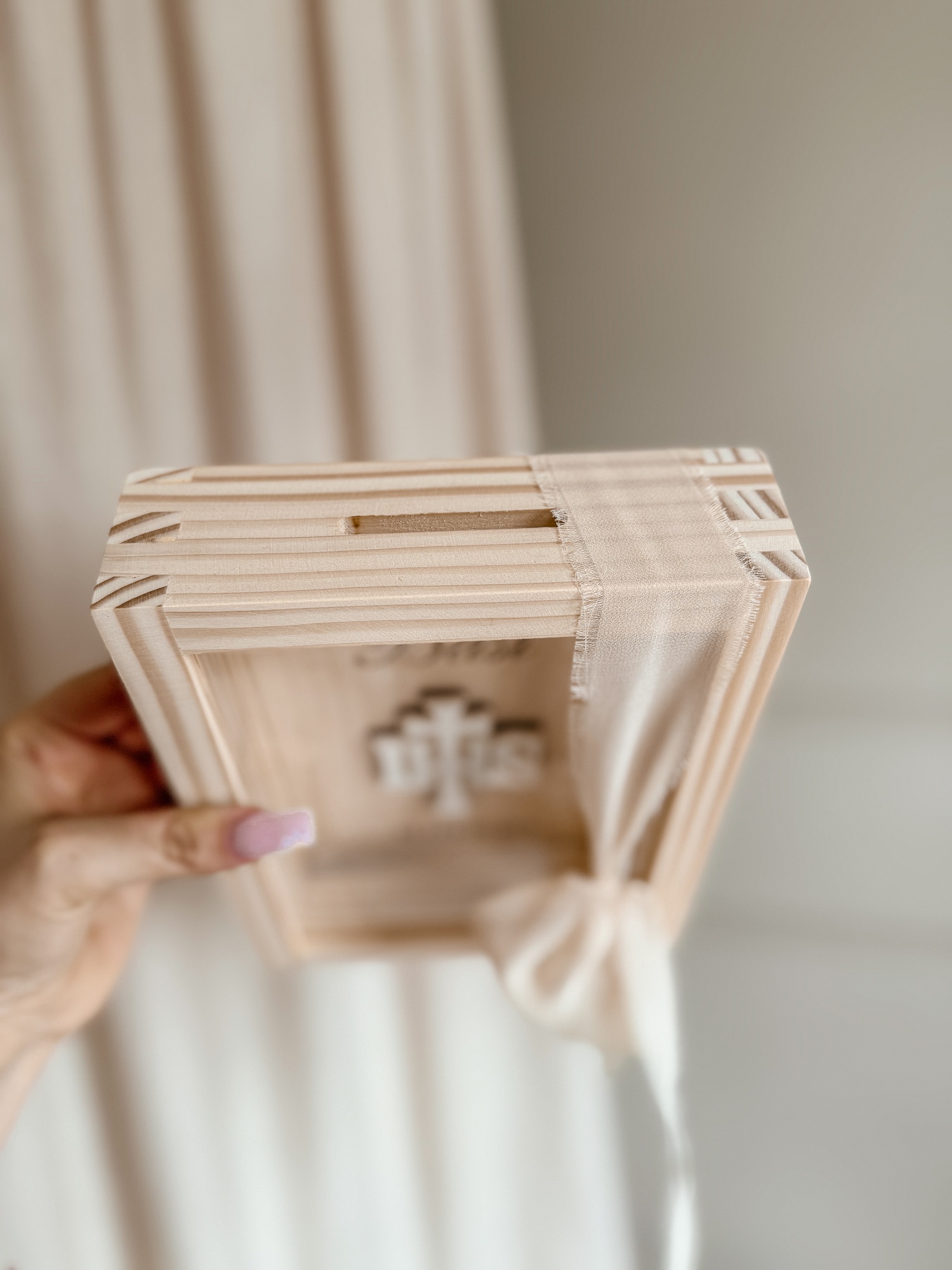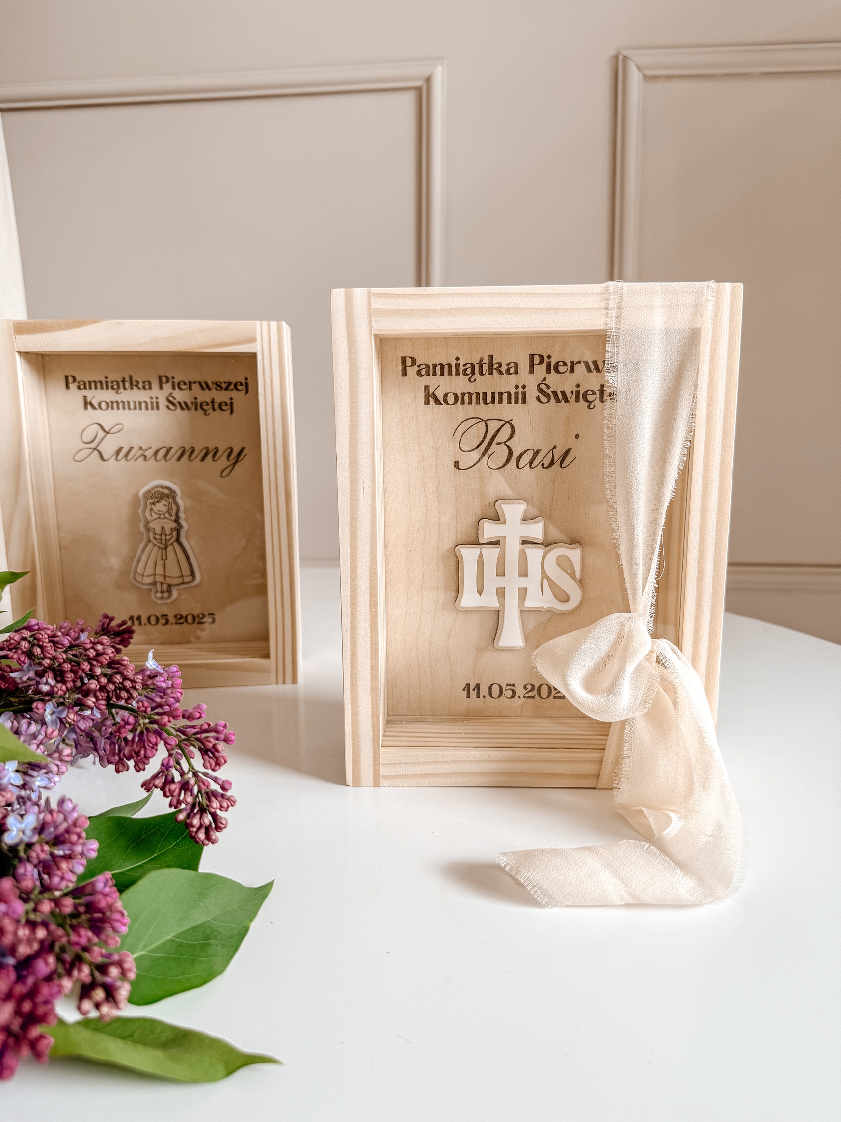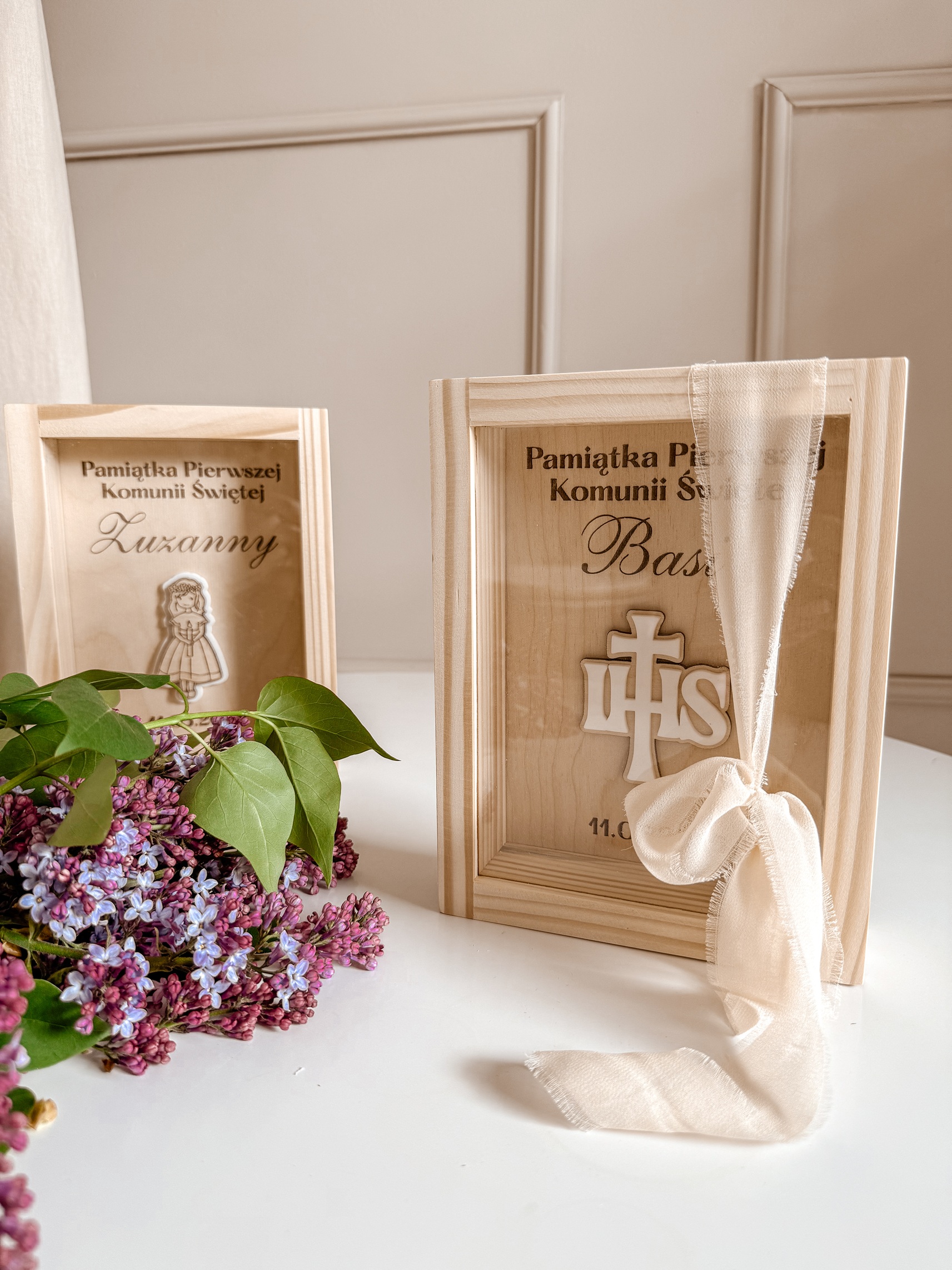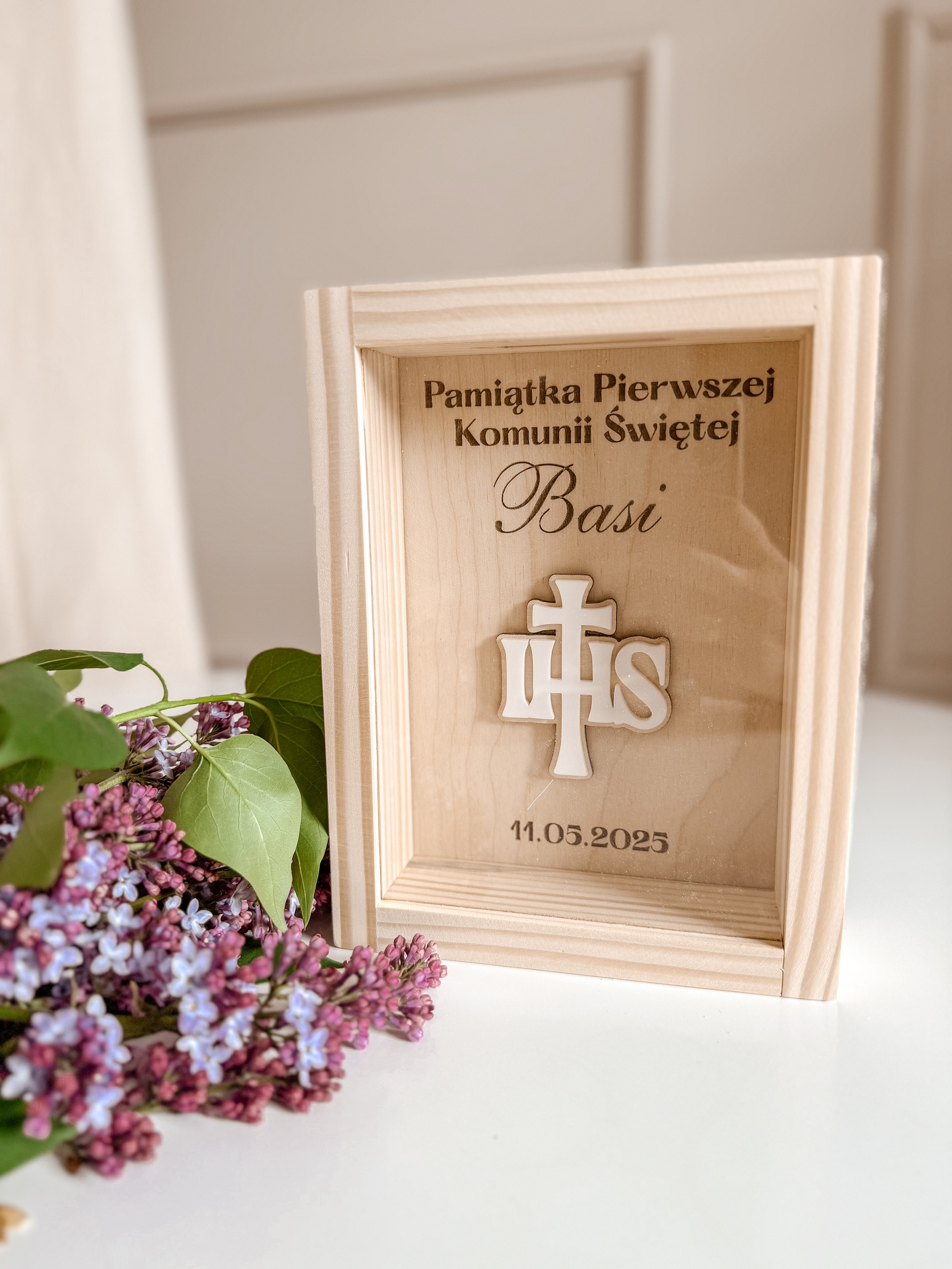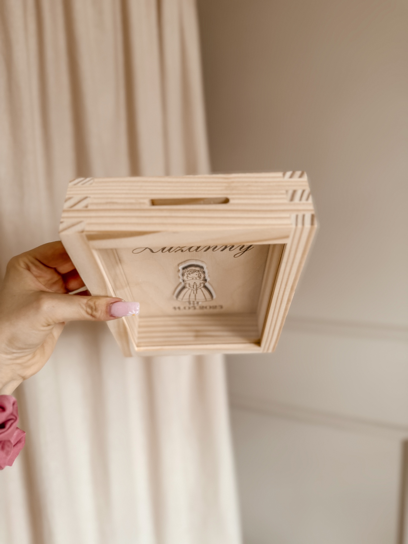 Elegancka i wyjątkowa pamiątka komunijna w formie drewnianej skarbonki z personalizowanym grawerem. Idealna jako prezent, który na lata zachowa wspomnienia z tego wyjątkowego dnia.