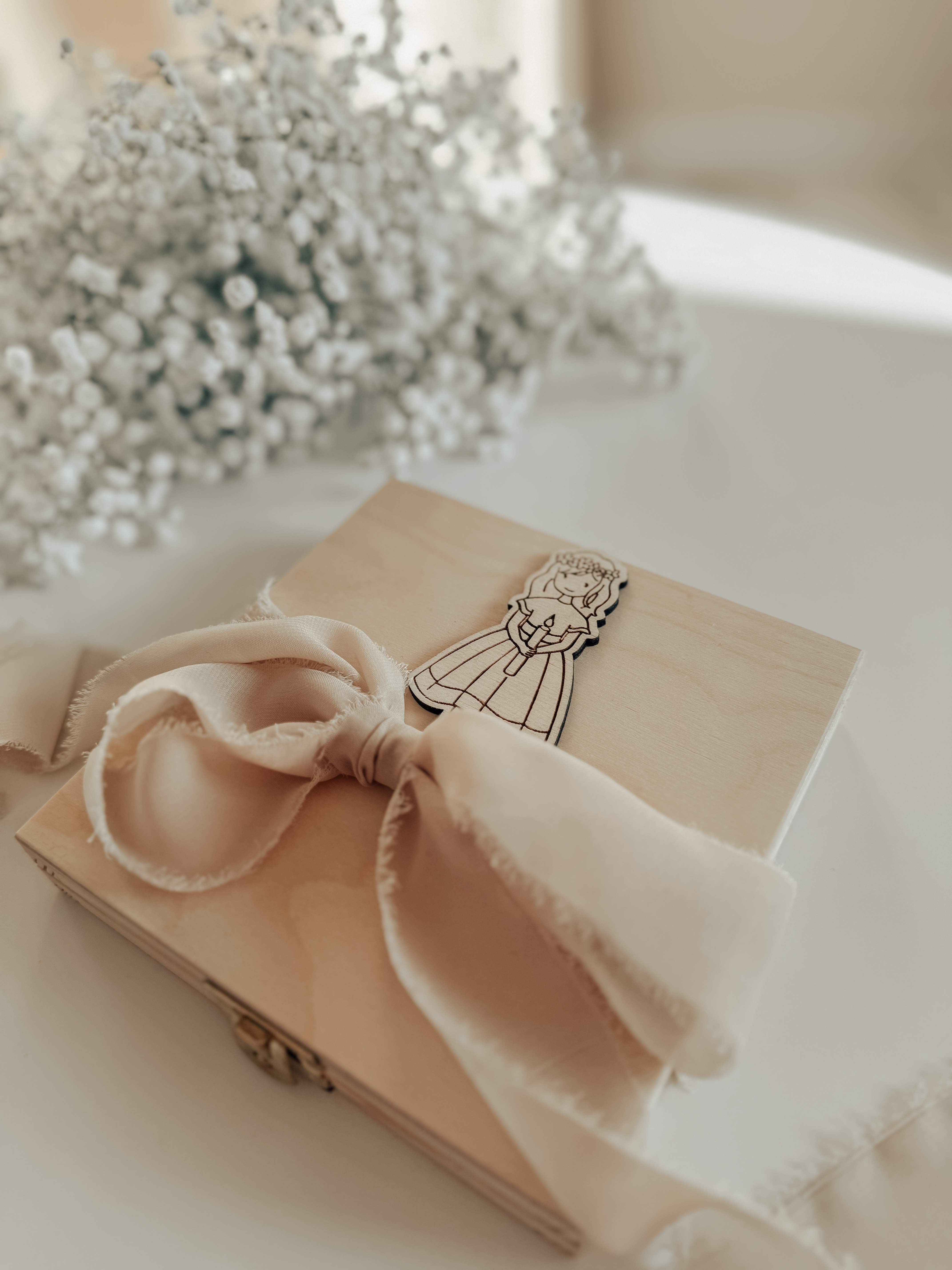 Materiał pudełka: drewno sosnowe naturalne ze złotym zamknięciem.