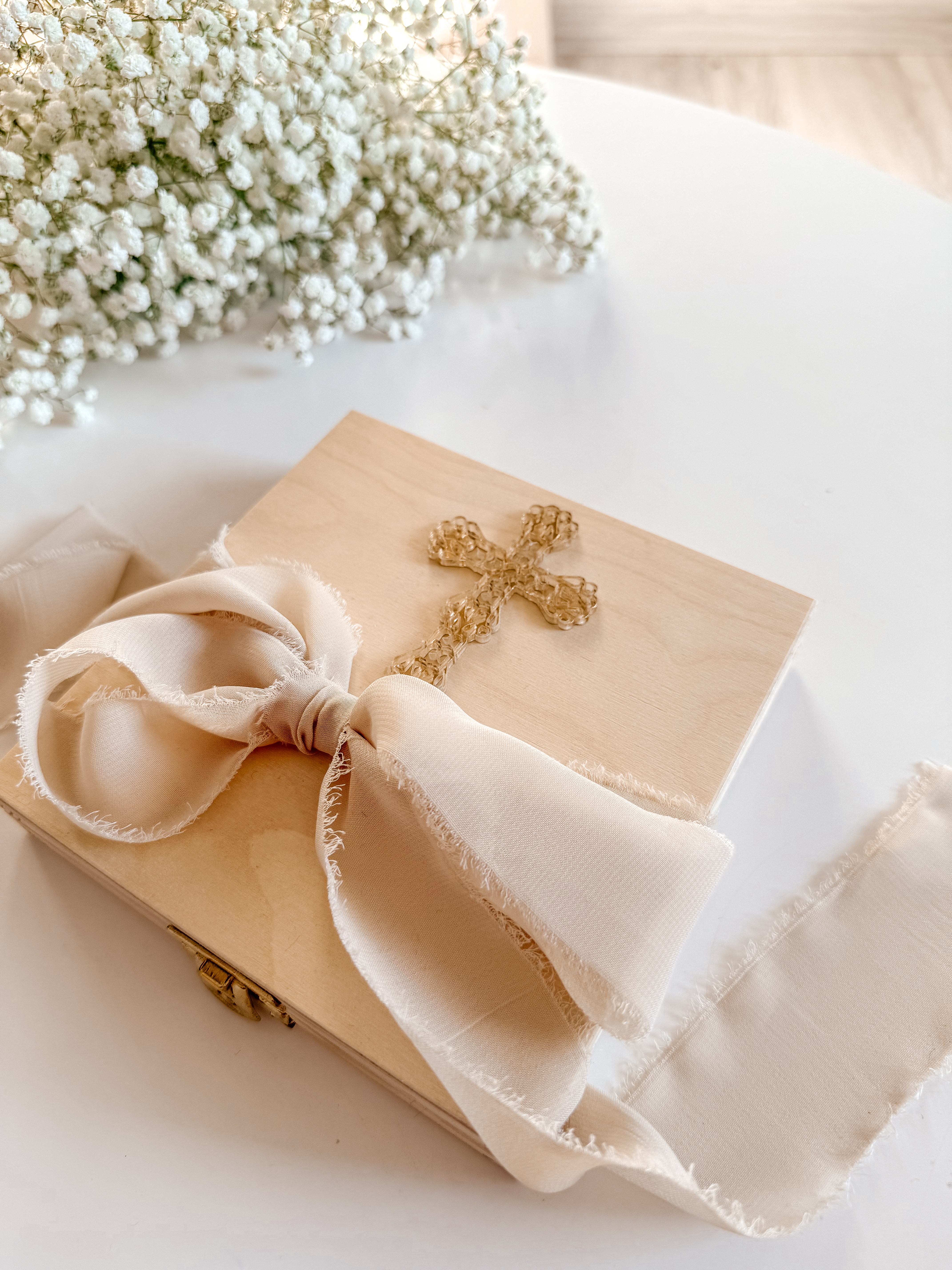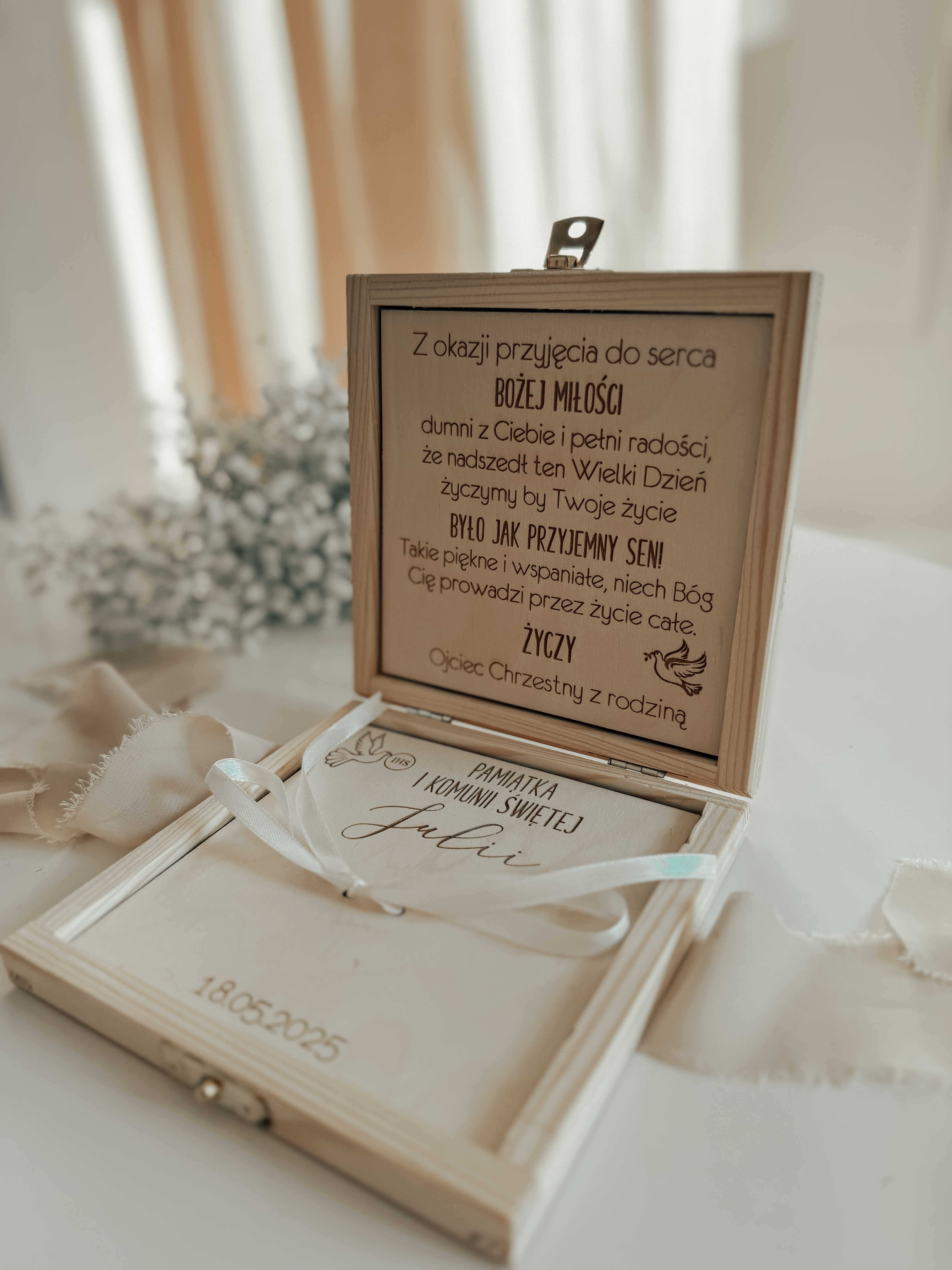 Materiał pudełka: drewno sosnowe naturalne ze złotym zamknięciem.