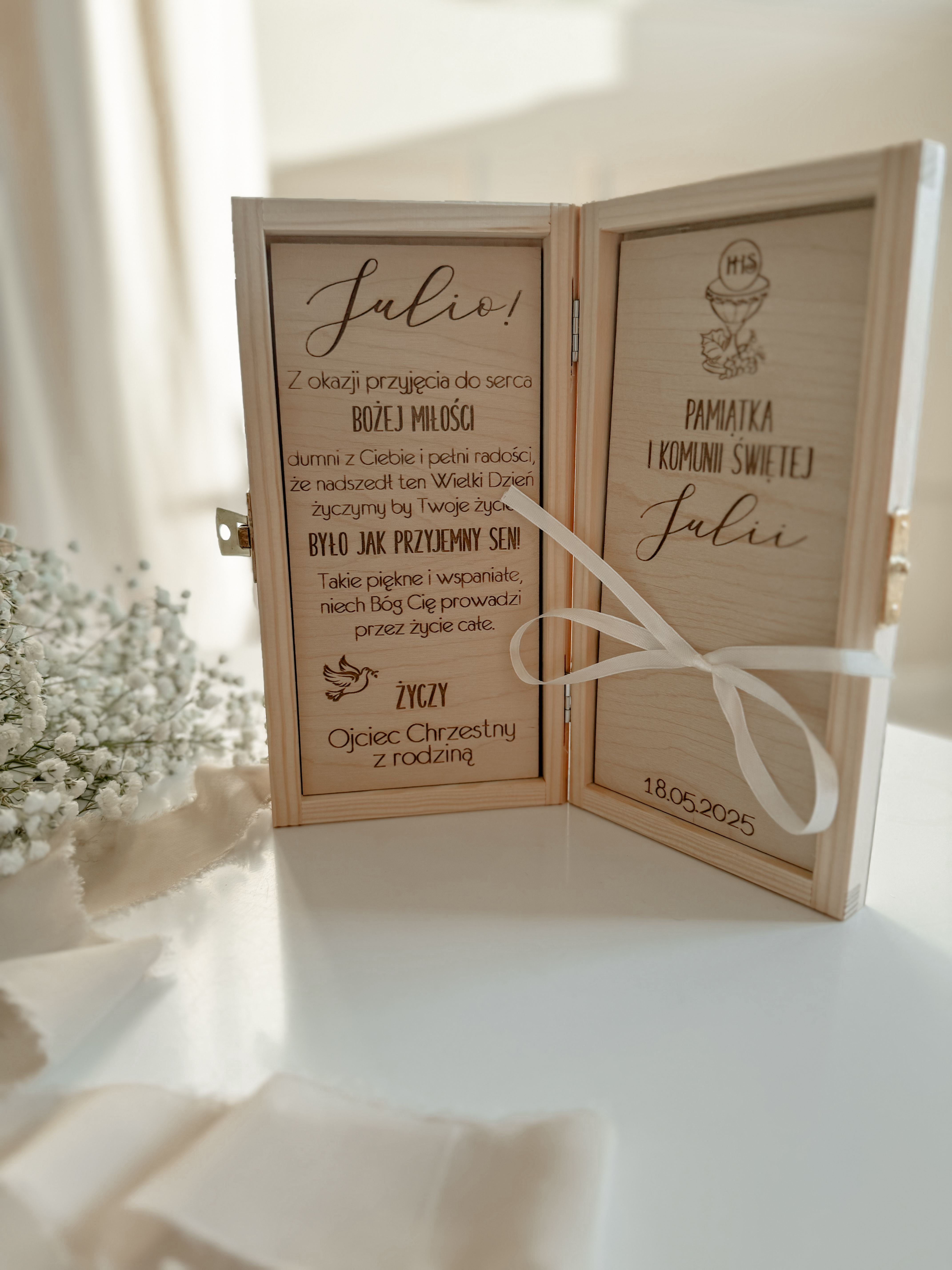 Drewniane pudełko z życzeniami na Komunię Świętą, które będzie niezwykłą pamiątką .