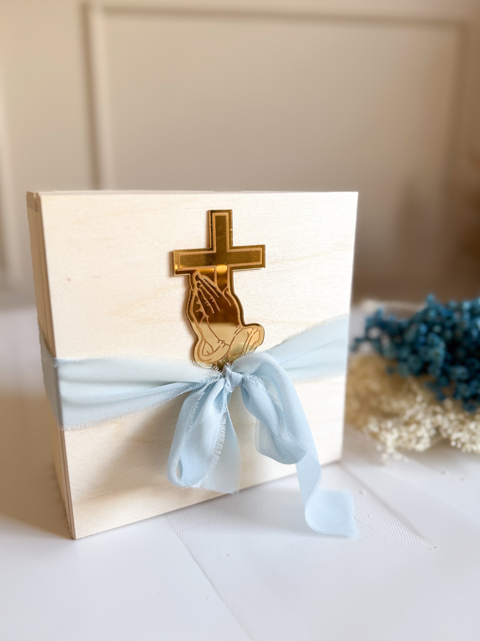 Subtelna, elegancka szkatułka wykonana z naturalnego drewna to wyjątkowa pamiątka Pierwszej Komunii Świętej. Minimalistyczna forma, oraz delikatna, szyfonowa kokarda nadają jej lekkości i klasy.