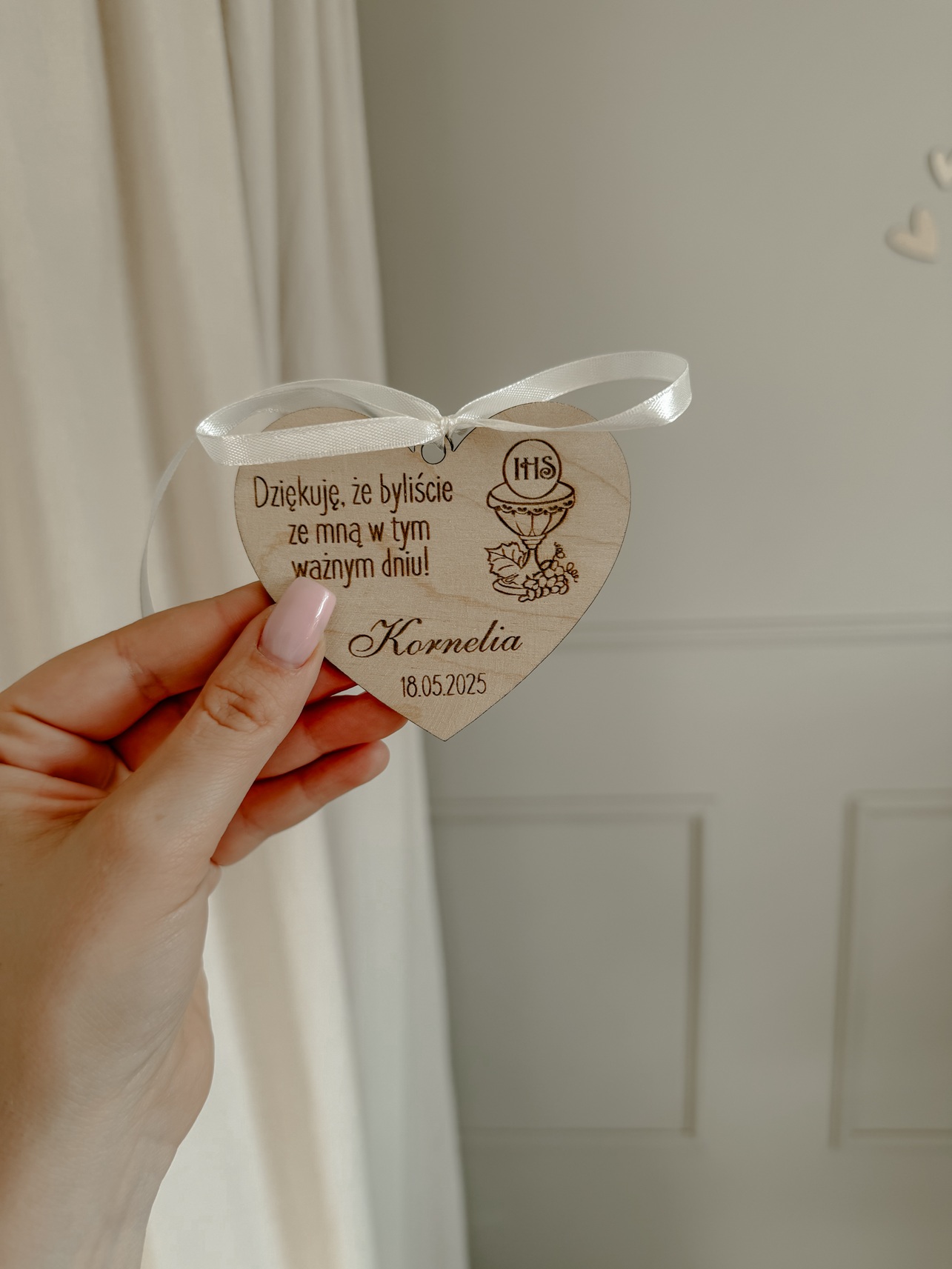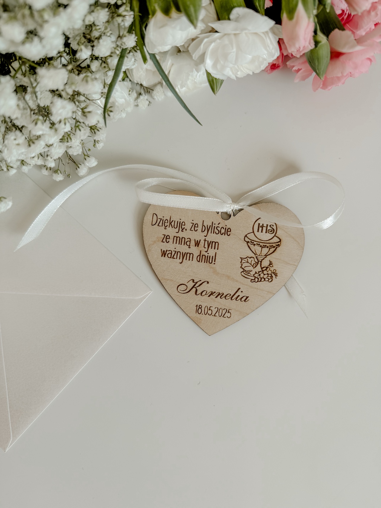 Magnes z dowolnym tekstem i wstążką w kolorze ecru na Komunię lub Chrzest Święty