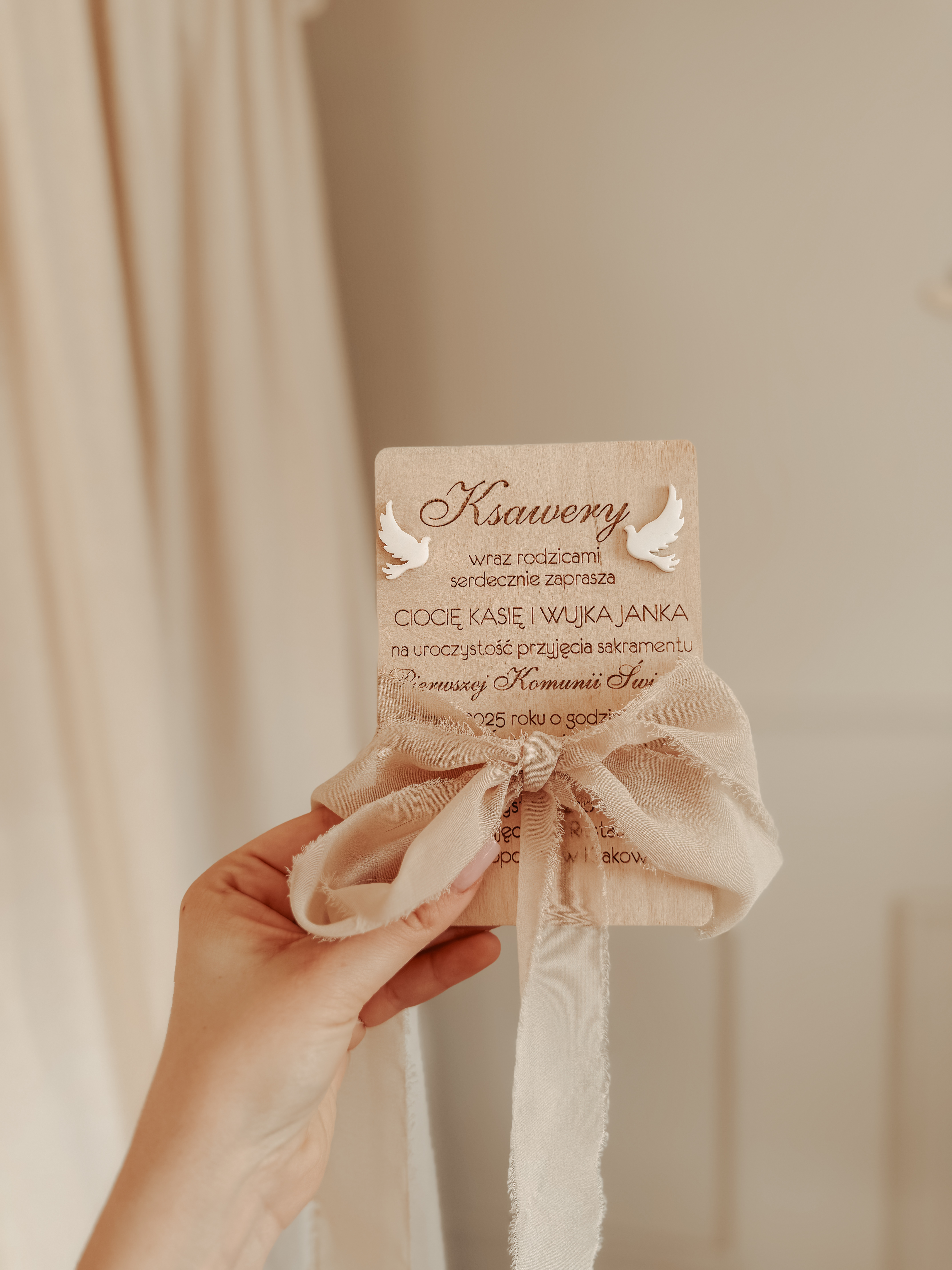 Zaproszenie ze wstążką szyfonową w kolorze beżowym na Komunię lub Chrzest Święty