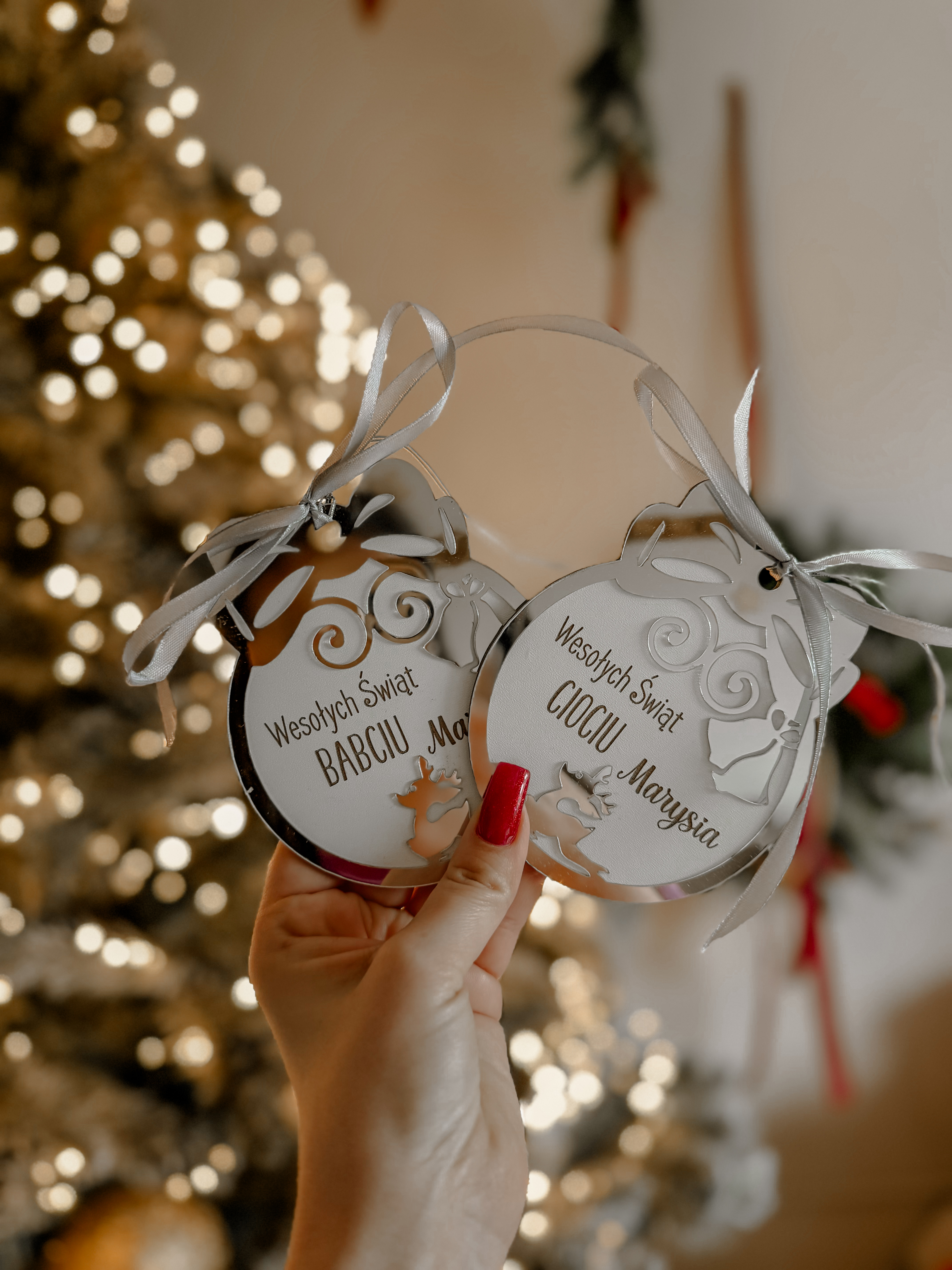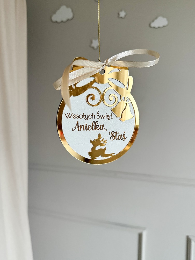 Bombka z efektem 3D. Zakończona sznureczkiem oraz wstążeczką w kolorze beżowym.