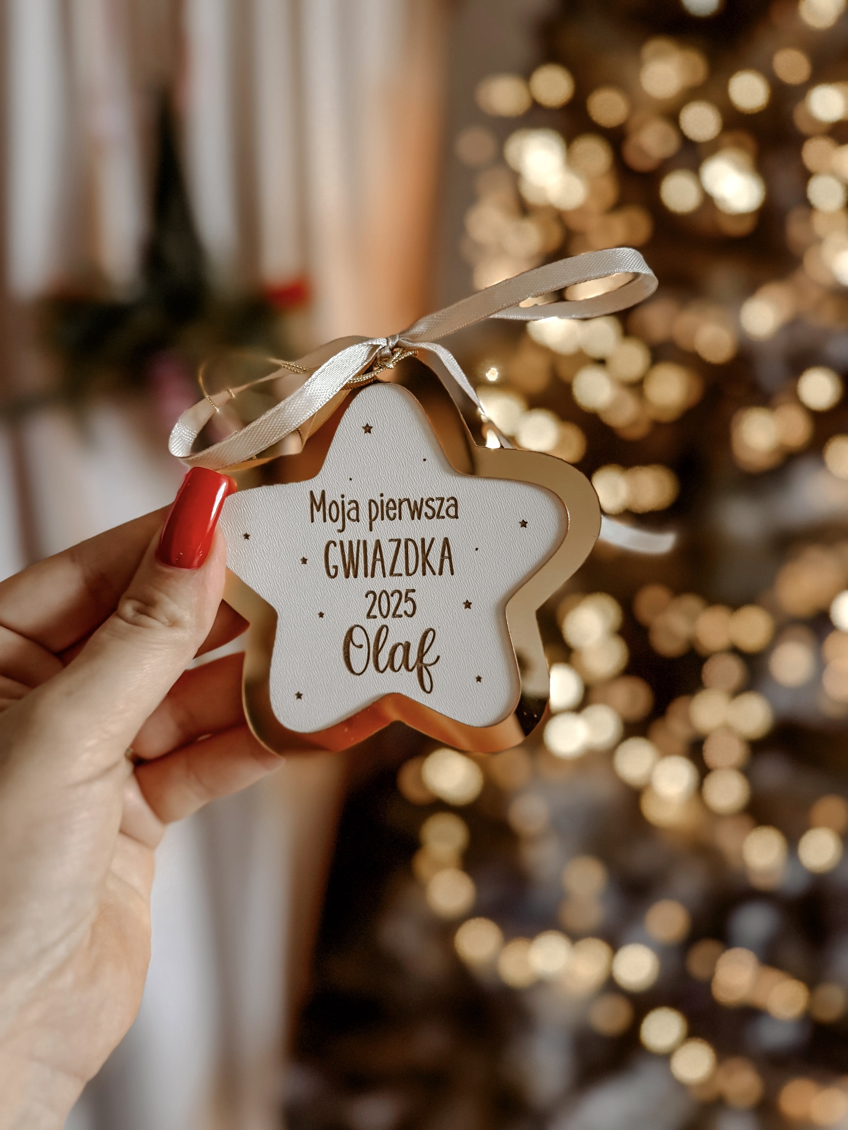 Bombka z efektem 3D w kształcie gwiazdki. Dostępna w 2 kolorach: złoty lustrzany, srebrny lustrzany. Zakończona sznureczkiem oraz wstążeczką