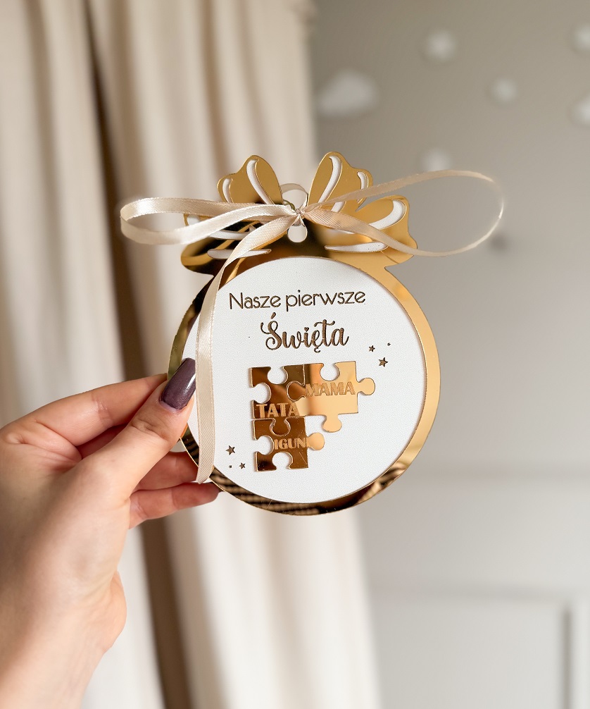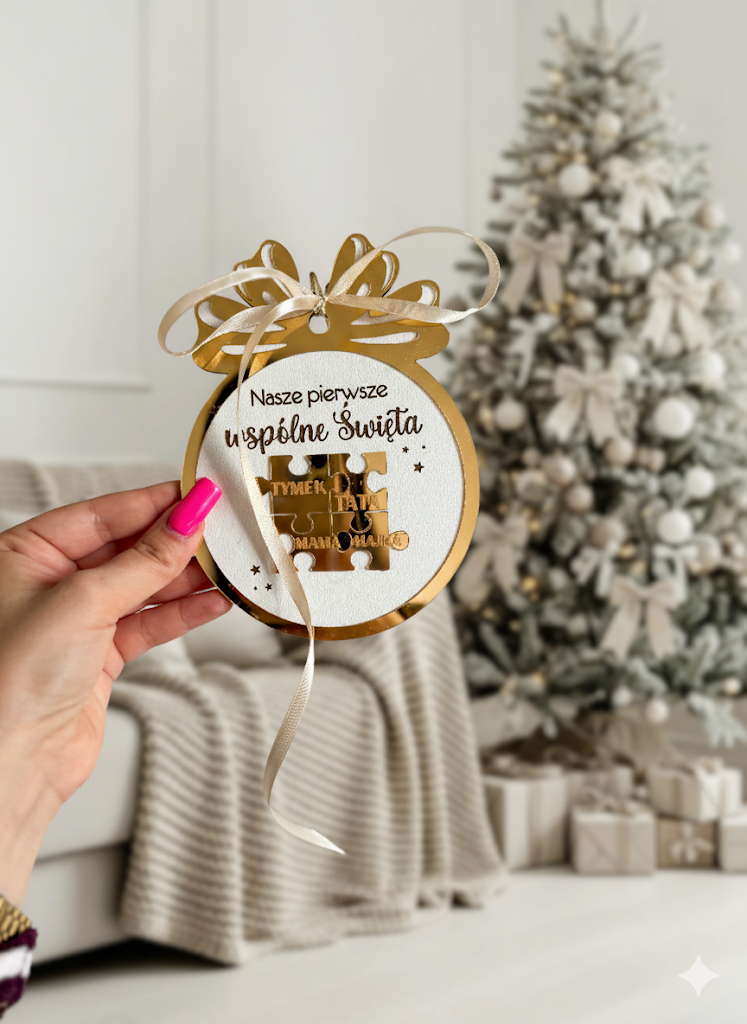 Bombka z efektem 3D. Zakończona sznureczkiem oraz wstążeczką w kolorze beżowym.
