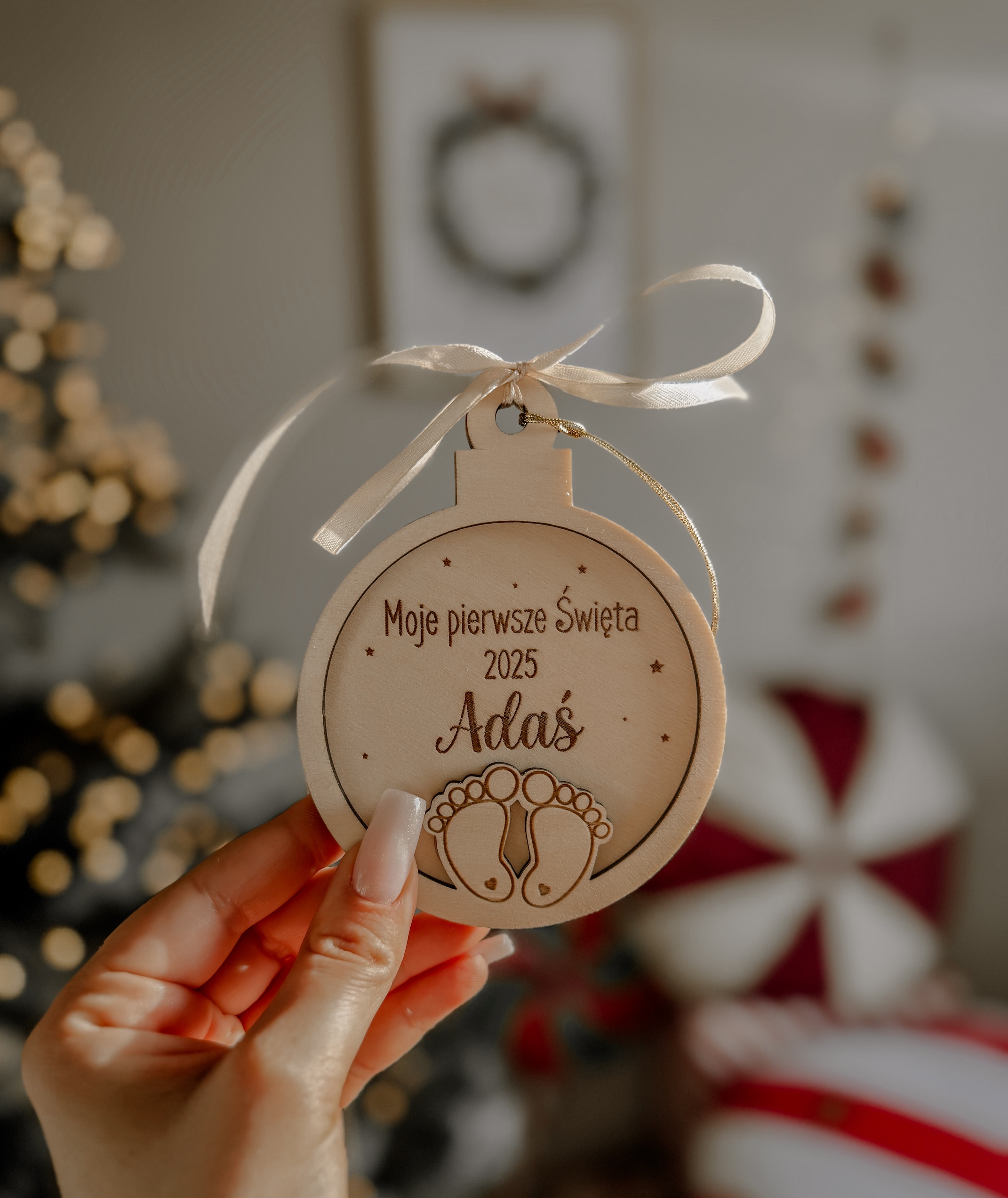 Bombka z efektem 3D. Zakończona sznureczkiem oraz wstążeczką w kolorze beżowym.