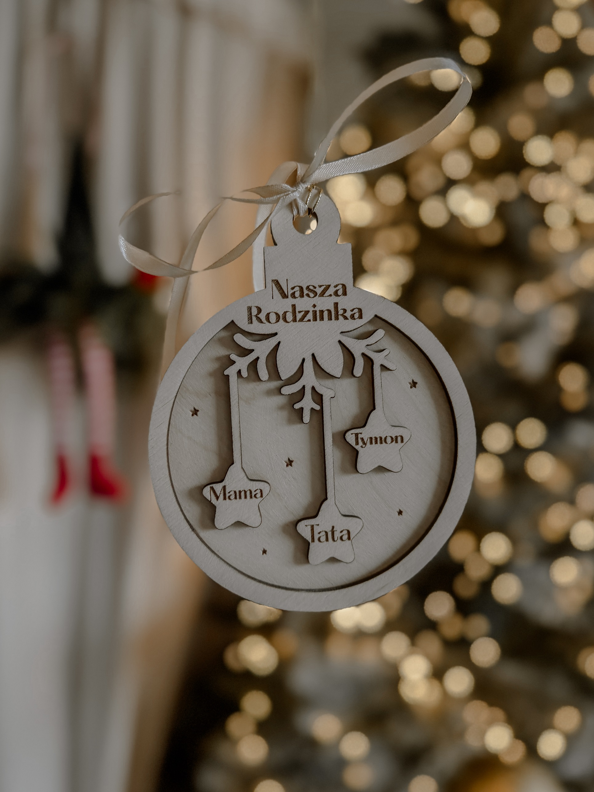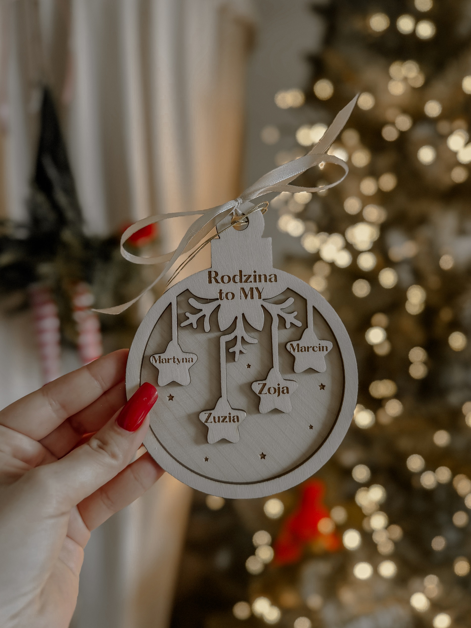 Bombka z efektem 3D, w gwiazdkach znajdują się poszczególne imiona członków rodziny. Możliwość 5 gwiazdek. Zakończona sznureczkiem oraz wstążeczką
