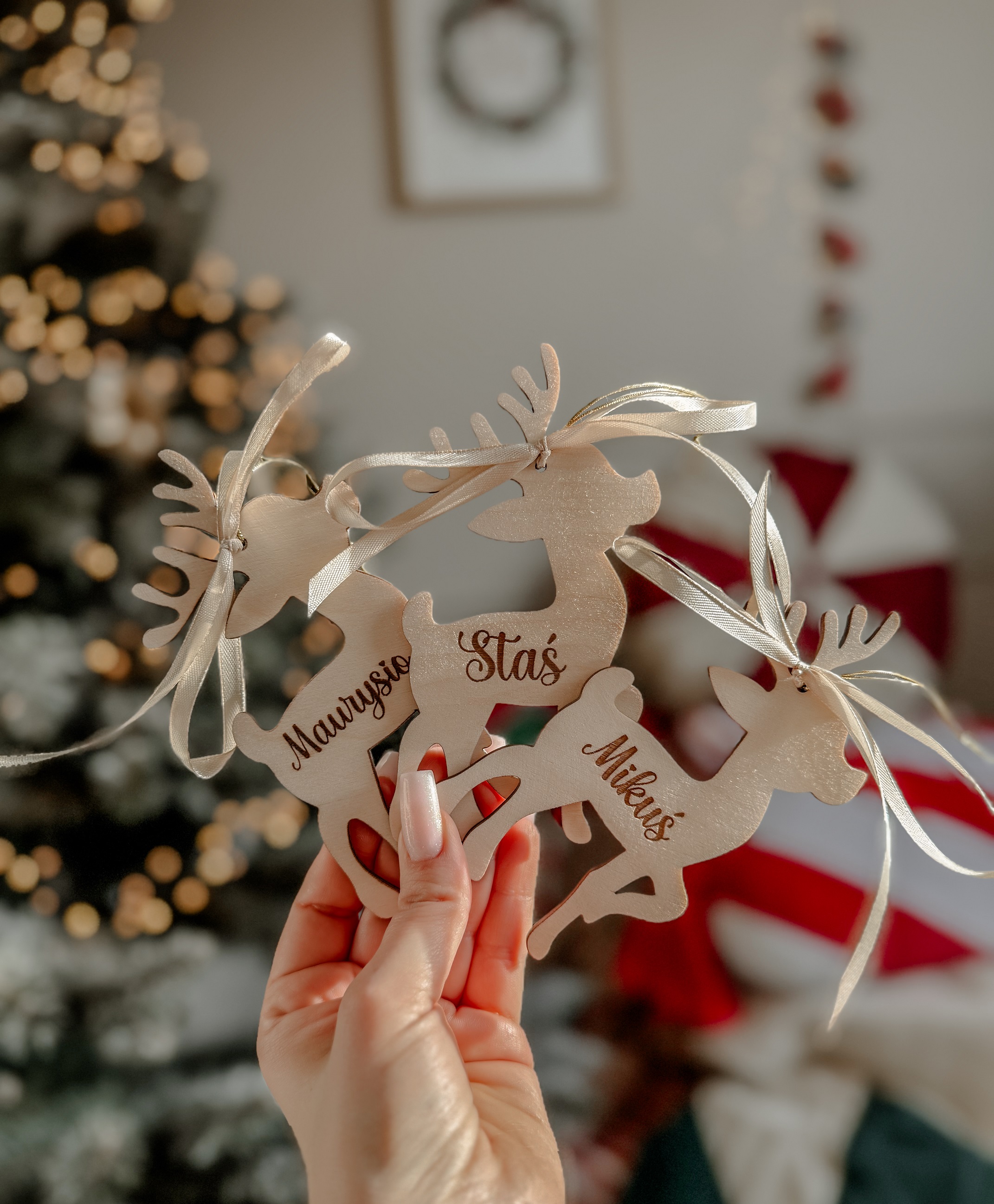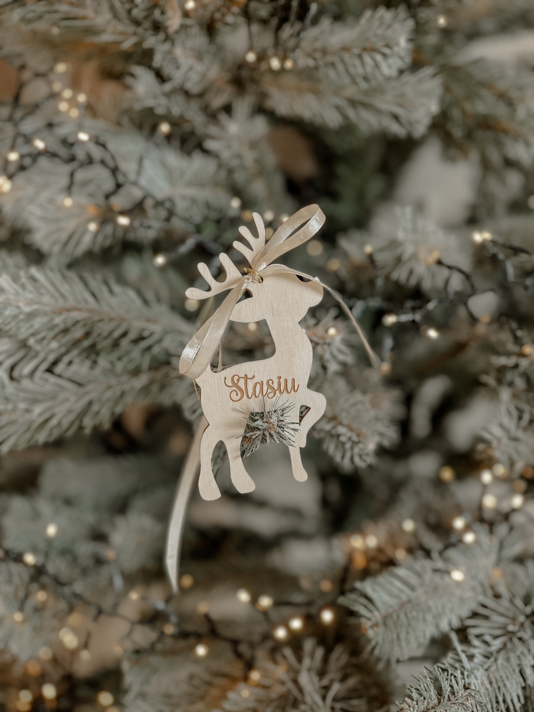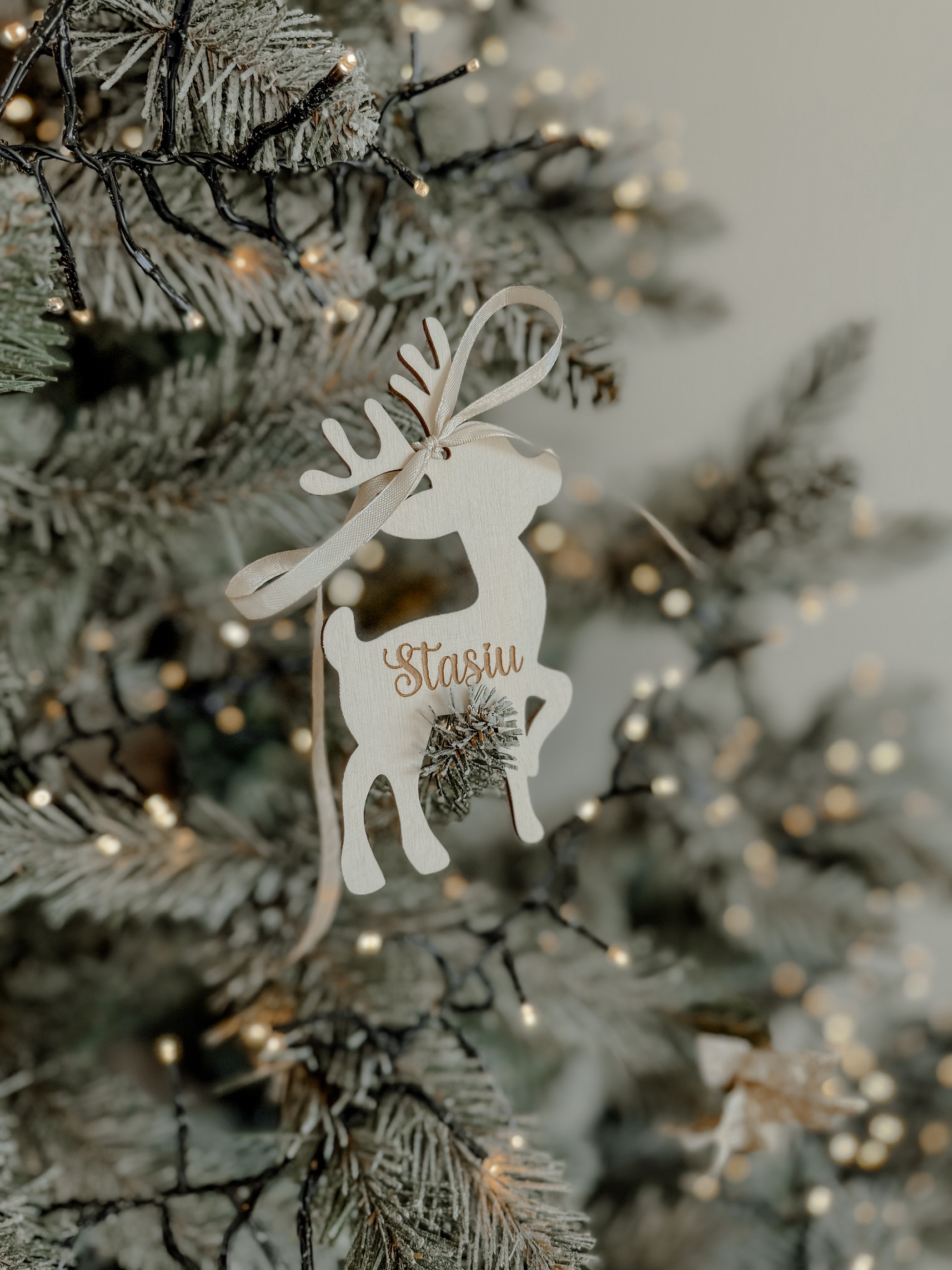 Zawieszka w kształcie reniferka. Zakończona sznureczkiem oraz wstążeczką w kolorze beżowym.