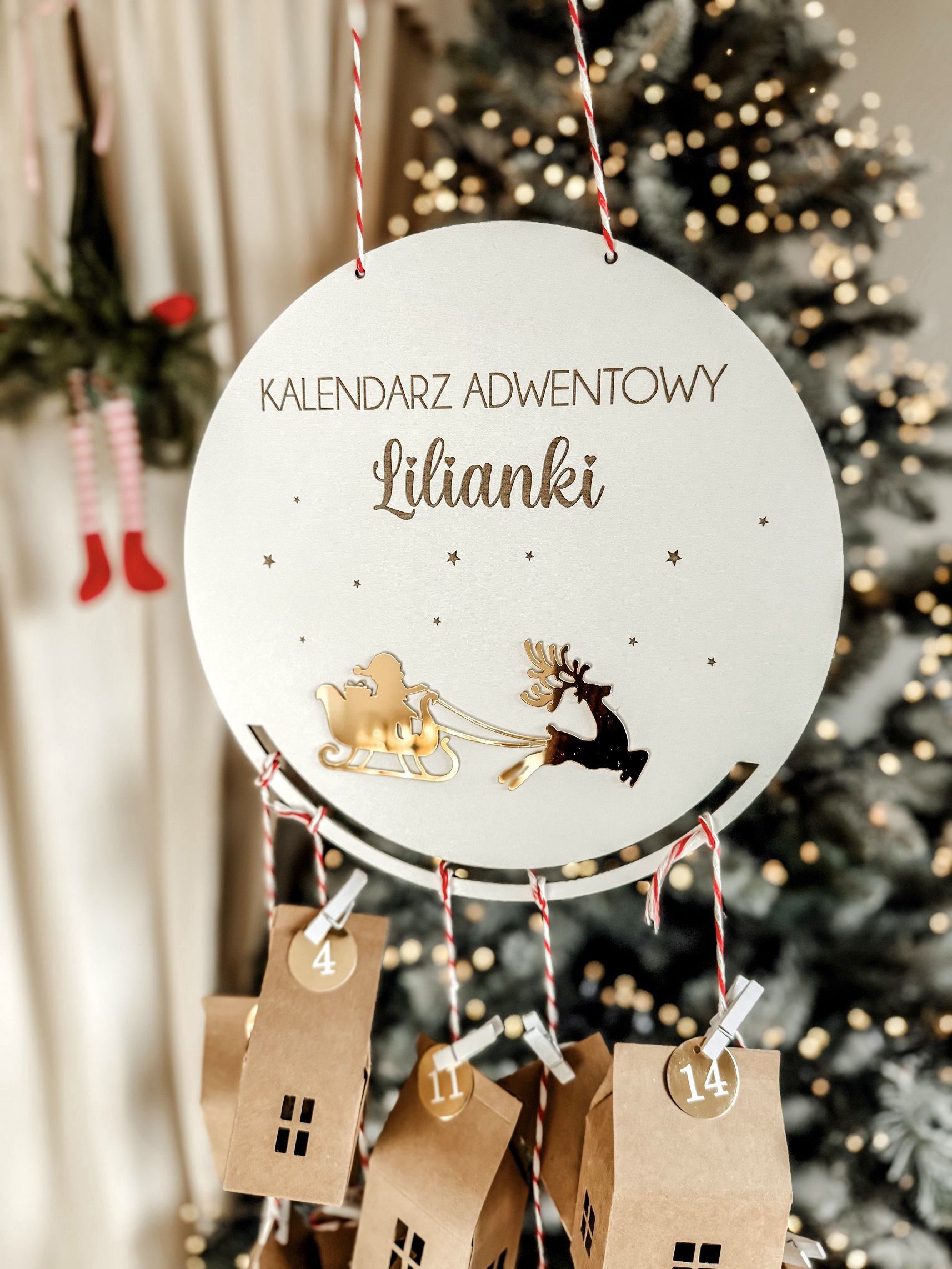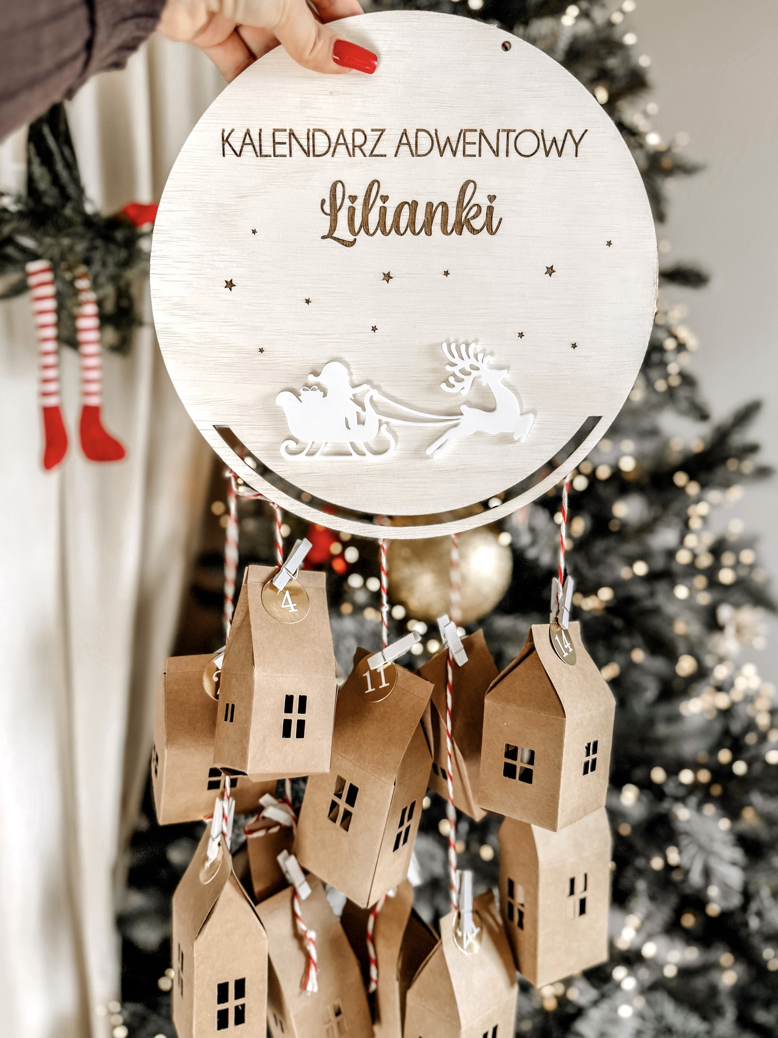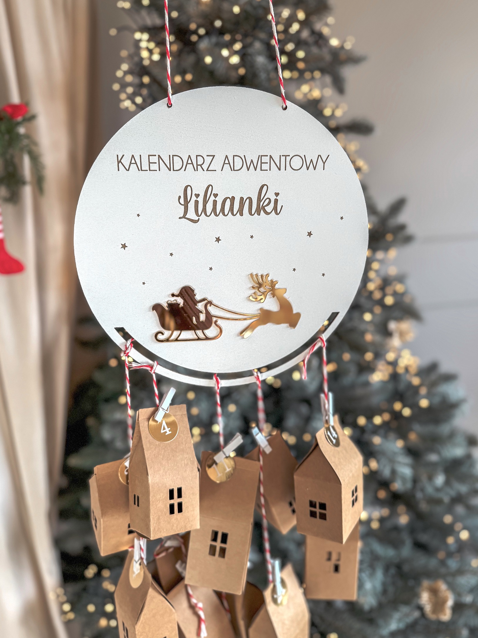 Możliwość dokupienia zestawu 24 domków wraz z klamerkami, sznurkiem, numeracją oraz bibułką do zawinięcia prezentów 😉
