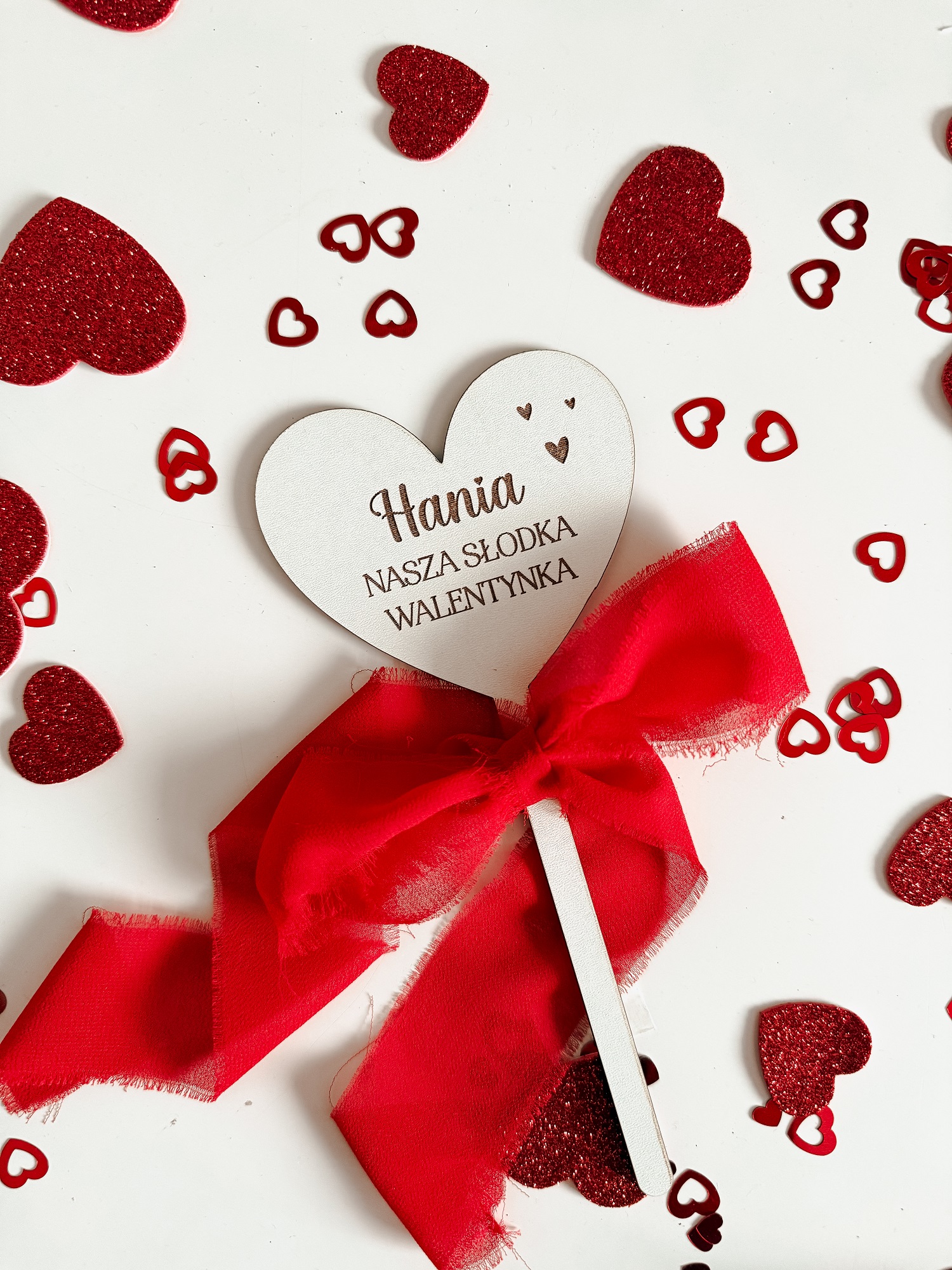 Różdżka serduszko z dowolnym tekstem, przewiązana wstążką szyfonową w kolorze czerwonym.